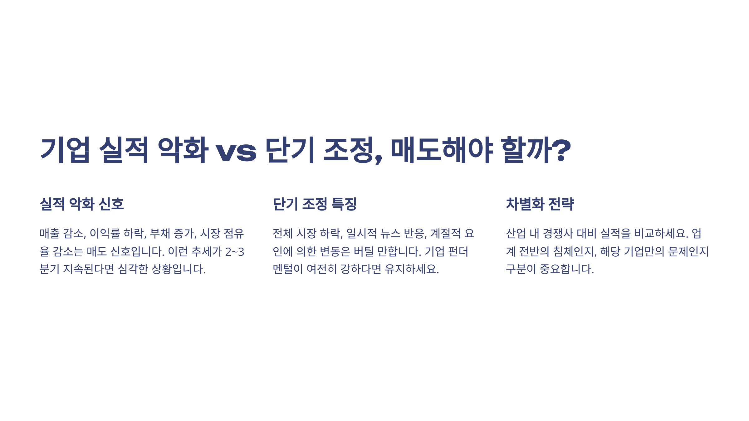 | 구분 | 단기 조정 (보유 가능) | 기업 실적 악화 (매도 고려) |