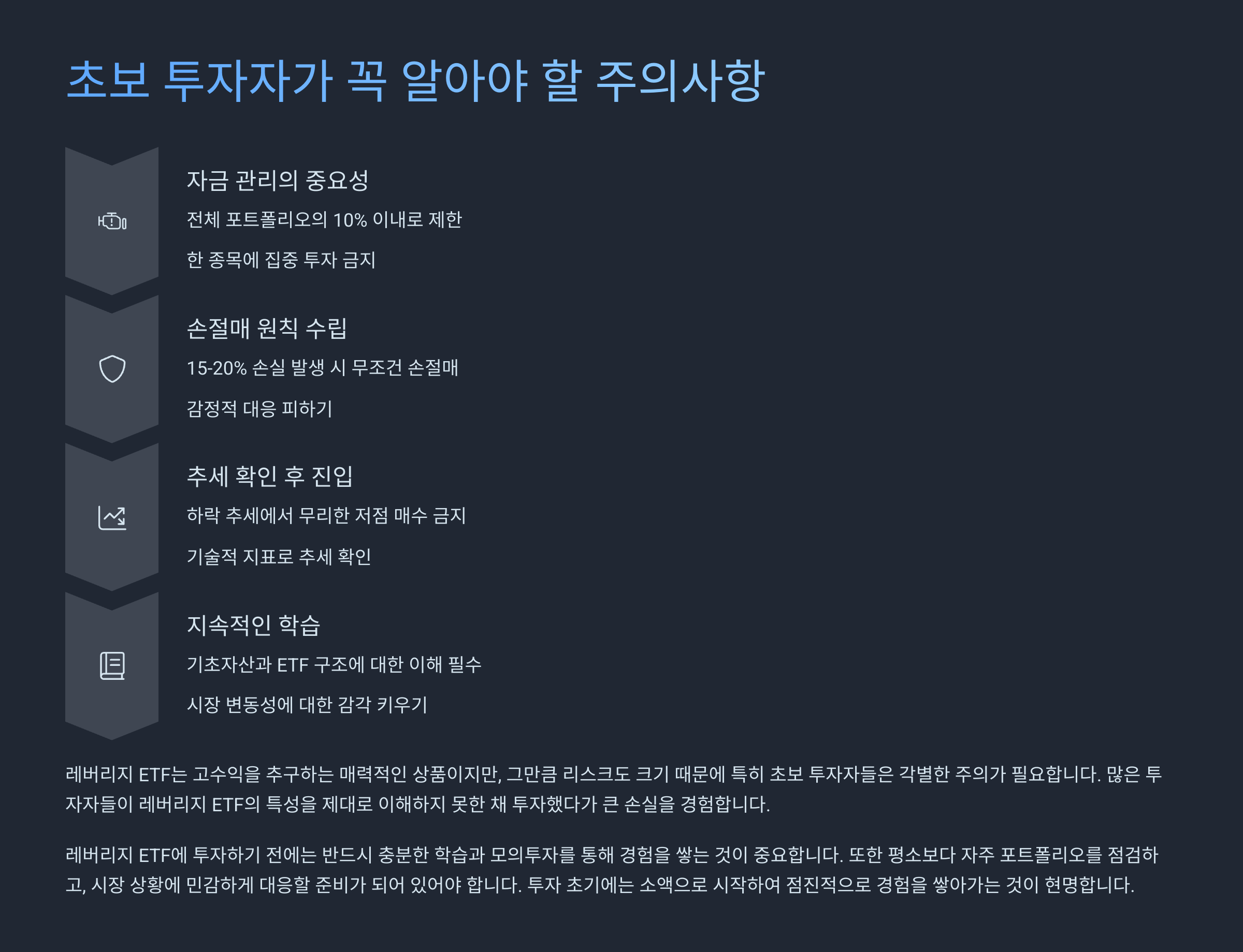 두 번째는 손절매 전략이에요. 레버리지 ETF는 하루에 10% 이상 빠지는 일도 심심찮게 발생해요. 이럴 땐 미련 두지 말고 철저하게 손절 기준을 세워야 해요. 초보 투자자가 가장 많이 실수하는 게 “조금만 더 기다리면 오르겠지…” 하는 마음이에요.