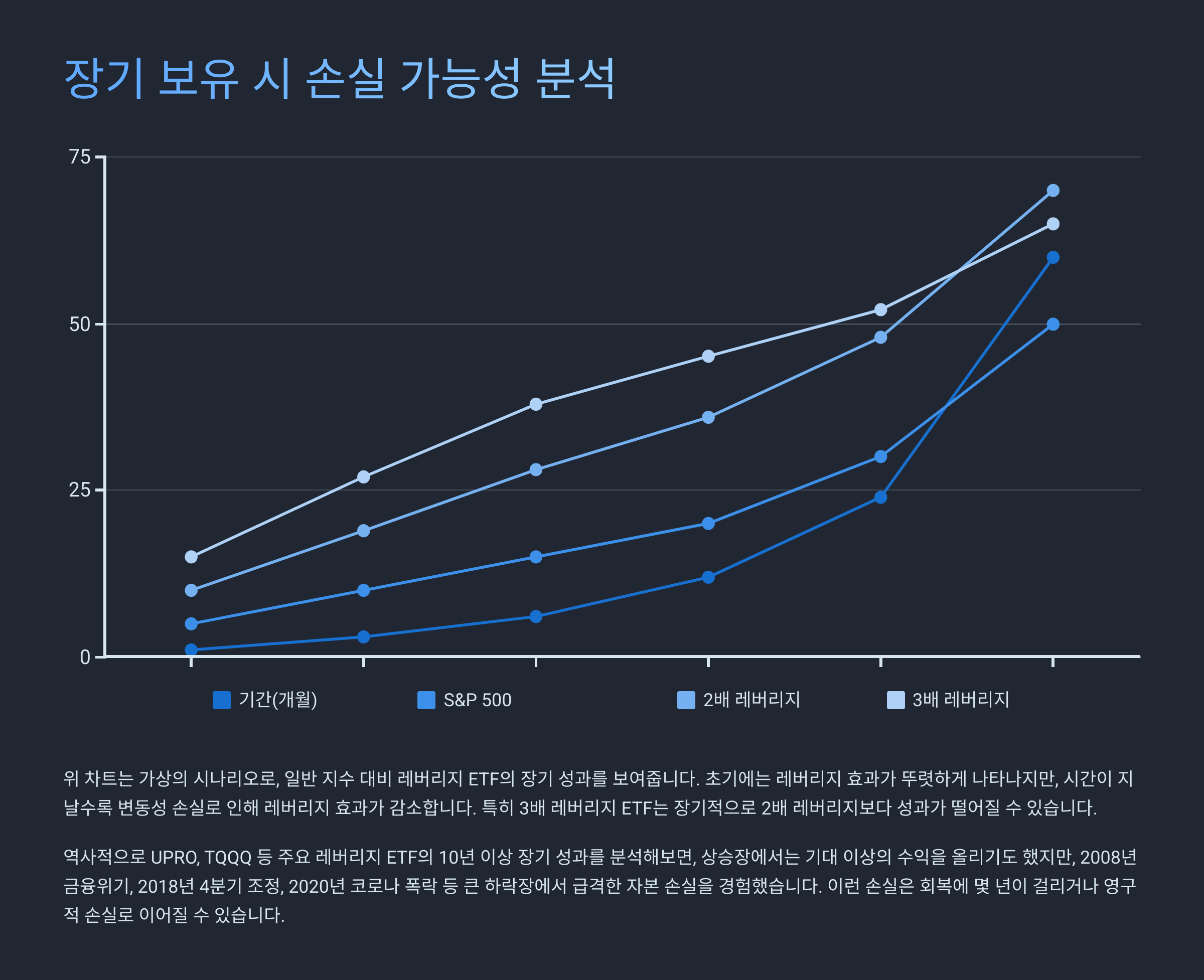 레버리지 ETF를 장기 보유하는 건 마치 매일 도박을 반복하는 것과 비슷한 구조가 돼요. 수익률이 매일 리셋되기 때문에, 일단 방향성이 없는 시장에선 그만큼 손실이 누적될 가능성이 커져요.