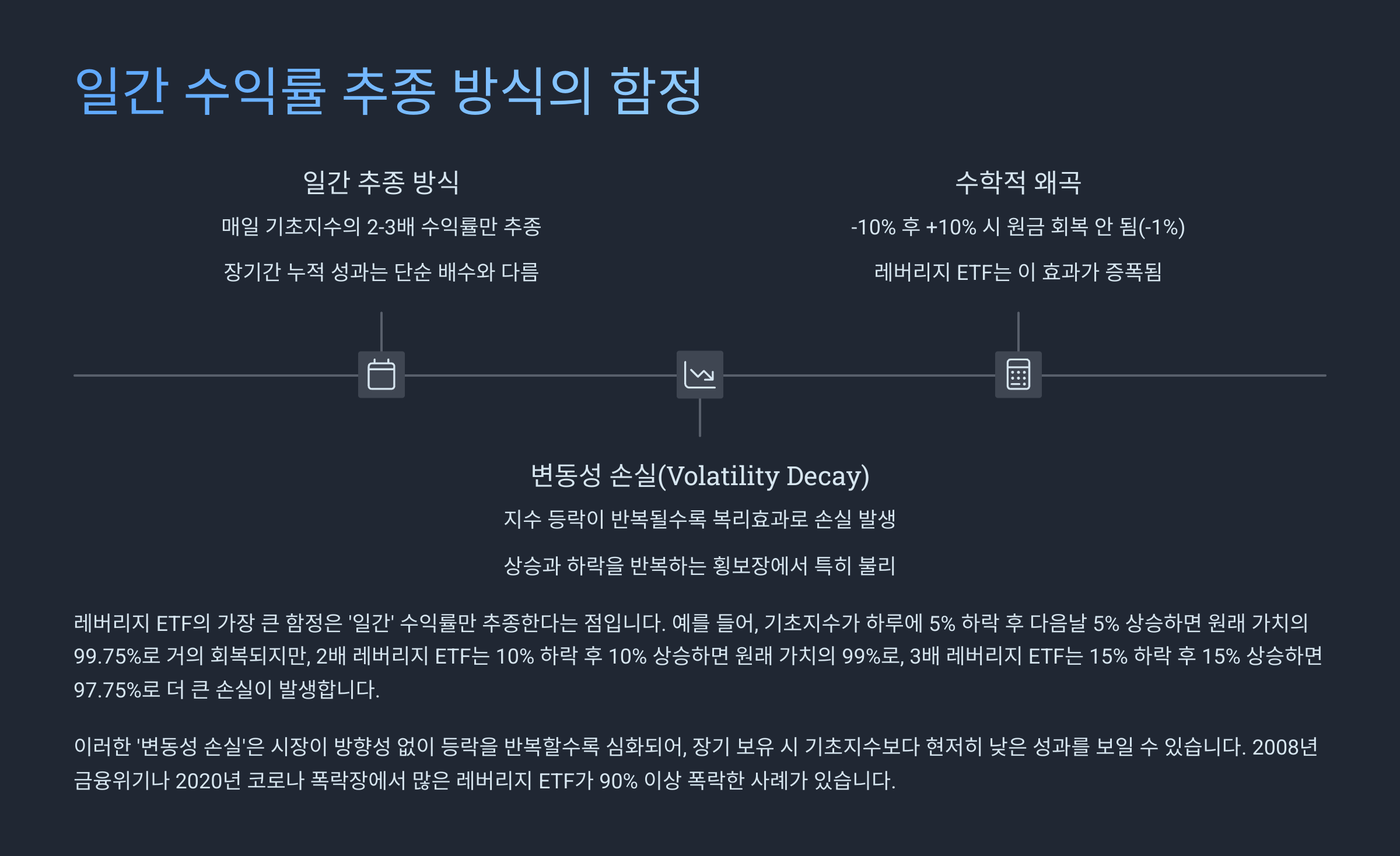 ETF가 매일 수익률을 추종하는 구조이기 때문에, 재조정 작업이 매일 이뤄지고, 이 과정에서 발생하는 슬리피지(slippage)나 비용 요소가 누적되면 손실이 생기죠. 이게 복잡한 듯하지만 투자자 입장에서는 단순히 “장기 보유하면 손해일 수 있다”로 기억하면 돼요.