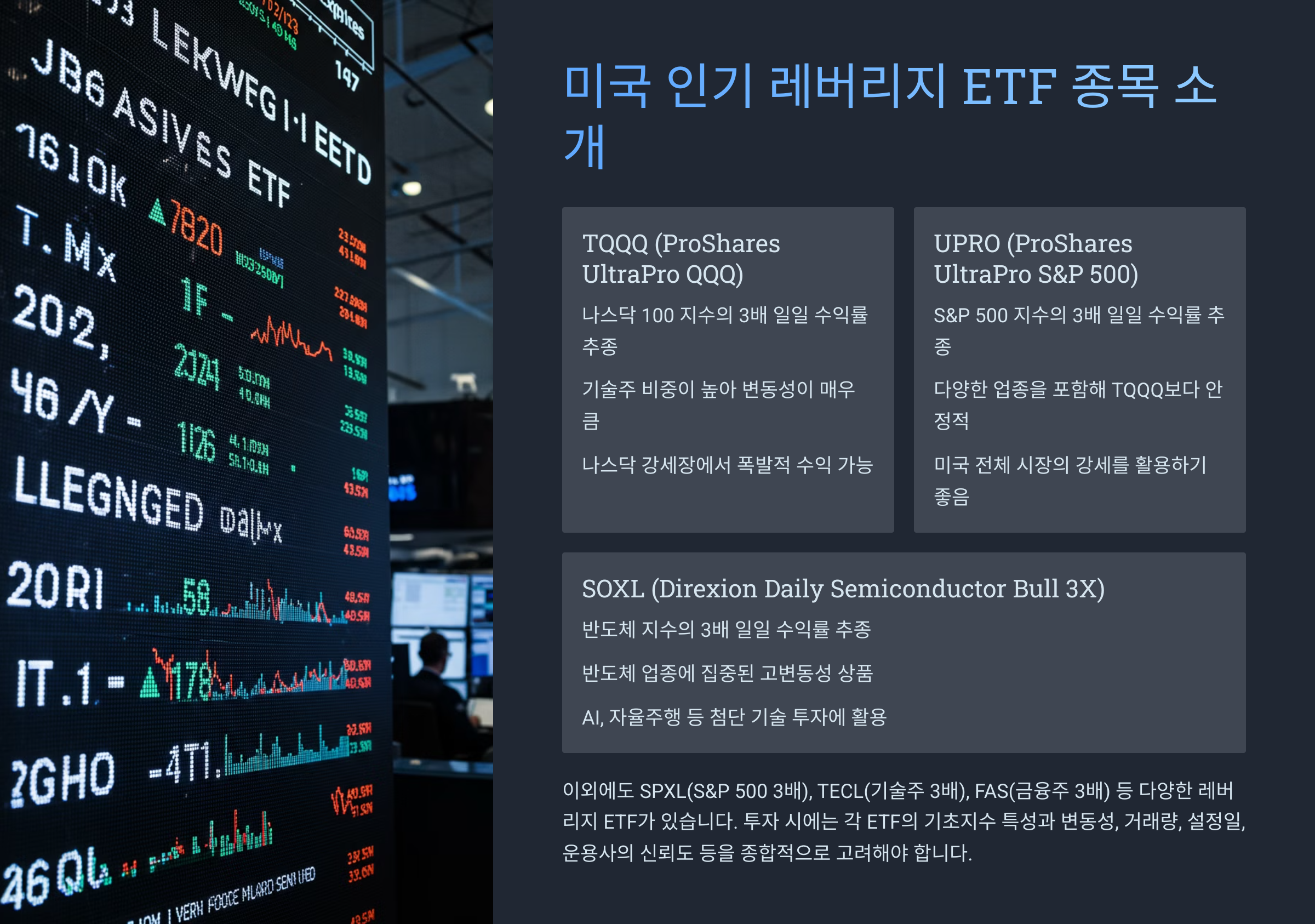 미국 주식시장에는 정말 다양한 레버리지 ETF가 상장되어 있어요. 그중에서 투자자들이 많이 찾는 종목들은 기술주 중심, 지수 중심, 테마 중심 ETF들인데요. 아래 종목들은 특히 거래량도 많고 시장 반응도 활발하답니다!