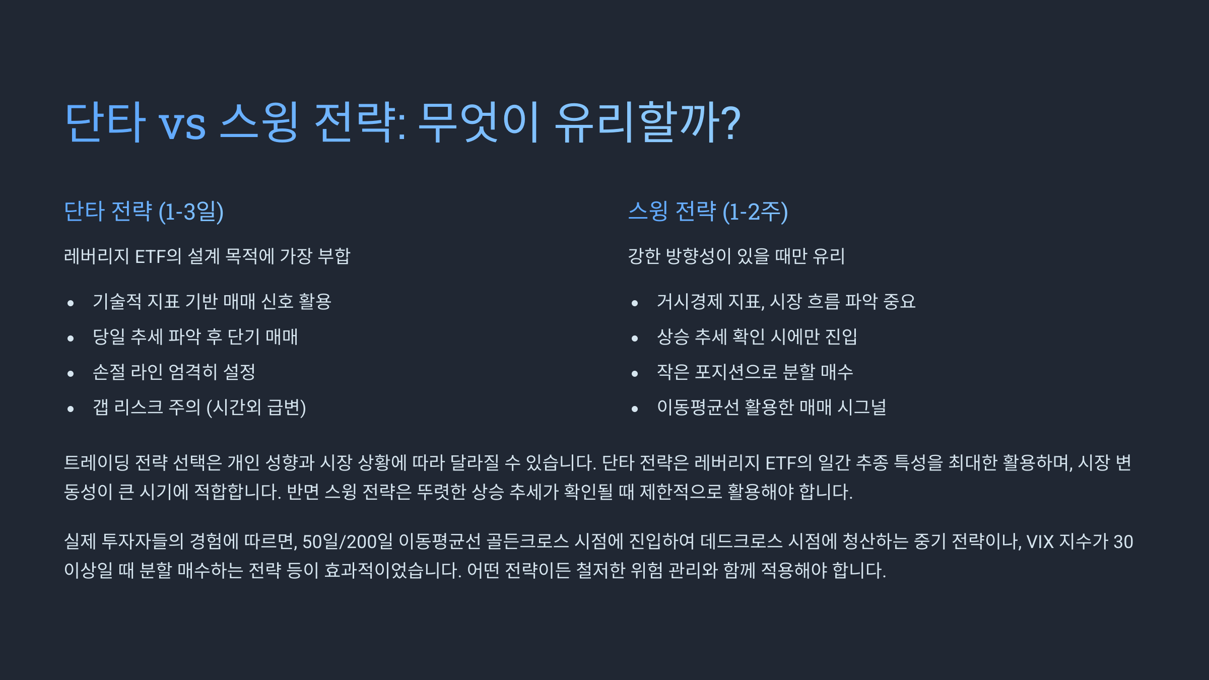 레버리지 ETF는 투자 전략에 따라 명확한 승패가 갈려요. 단타(데이 트레이딩)는 하루 안에 진입과 청산을 마치는 전략으로, ETF의 일간 수익률 구조와 가장 잘 맞아떨어지는 방식이에요.