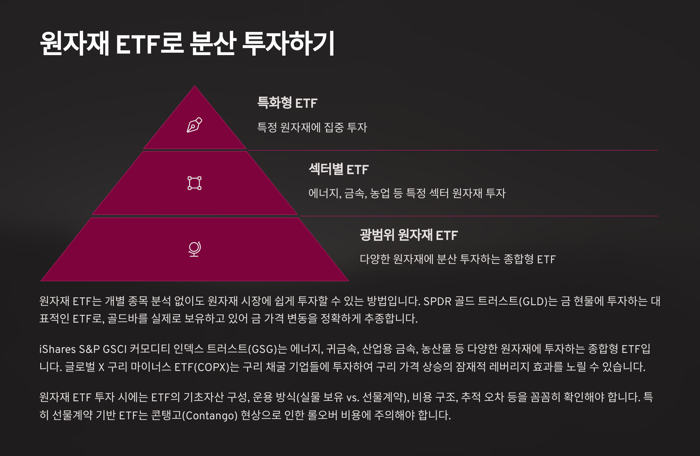 원자재는 가격 변동성이 크기 때문에 개별 종목보다 ETF로 분산 투자하는 방식이 더 안전할 수 있어요. ETF는 다양한 원자재에 투자하면서도 거래가 간편하고 수수료도 낮다는 장점이 있어요📊