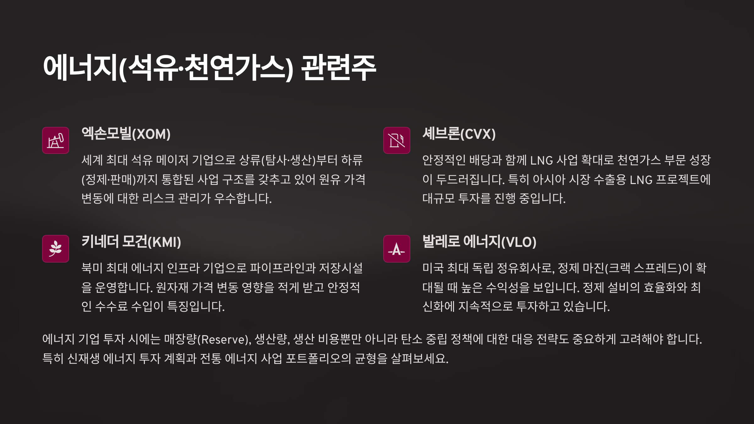 에너지주 투자 시 주의할 점은, 유가나 천연가스 가격 변동이 기업 수익성에 직접 반영된다는 점이에요. 가격 급락 시 실적도 타격을 받을 수 있으니 유가 흐름과 함께 투자 판단을 해야 해요⛽