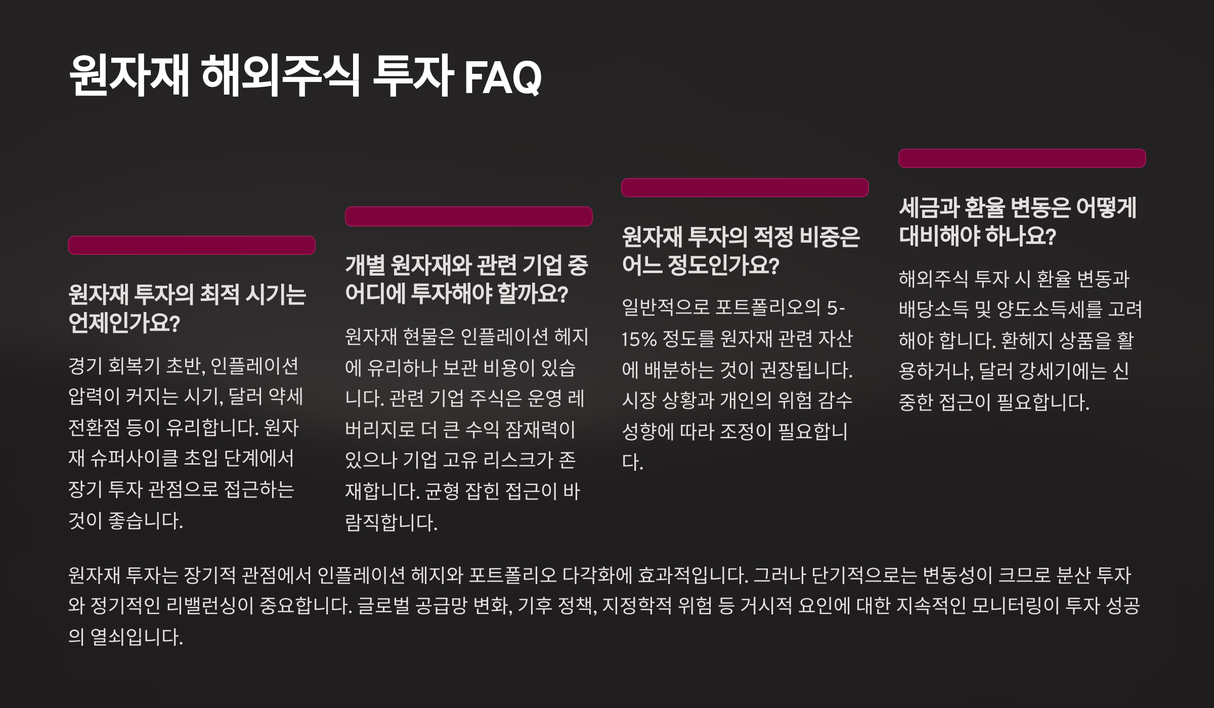이런 트렌드에 맞춰 자원을 생산하는 기업들이나 이를 운송·가공하는 기업들이 글로벌 증시에 상장돼 있어요. 그래서 원자재 흐름을 읽는 건 곧, 해외주식 투자 방향을 잡는 데도 큰 도움이 돼요🌐