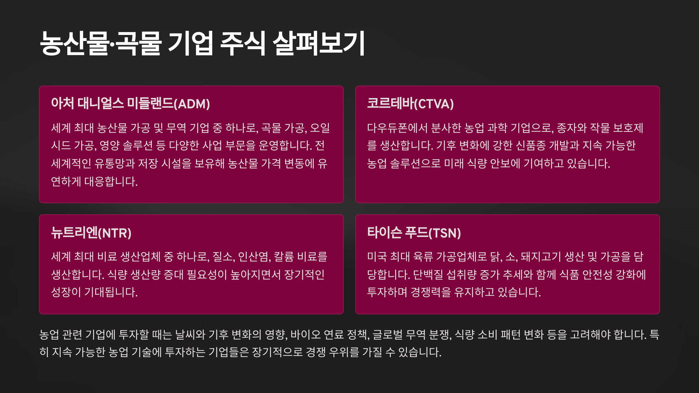대표적인 농산물 기업은 아처 대니얼스 미들랜드(ADM)벙지(Bunge Limited)예요. 이들은 글로벌 곡물 유통과 가공을 주도하는 업체로, 기후 이슈나 지정학적 리스크가 커질 때마다 주목을 받아요.