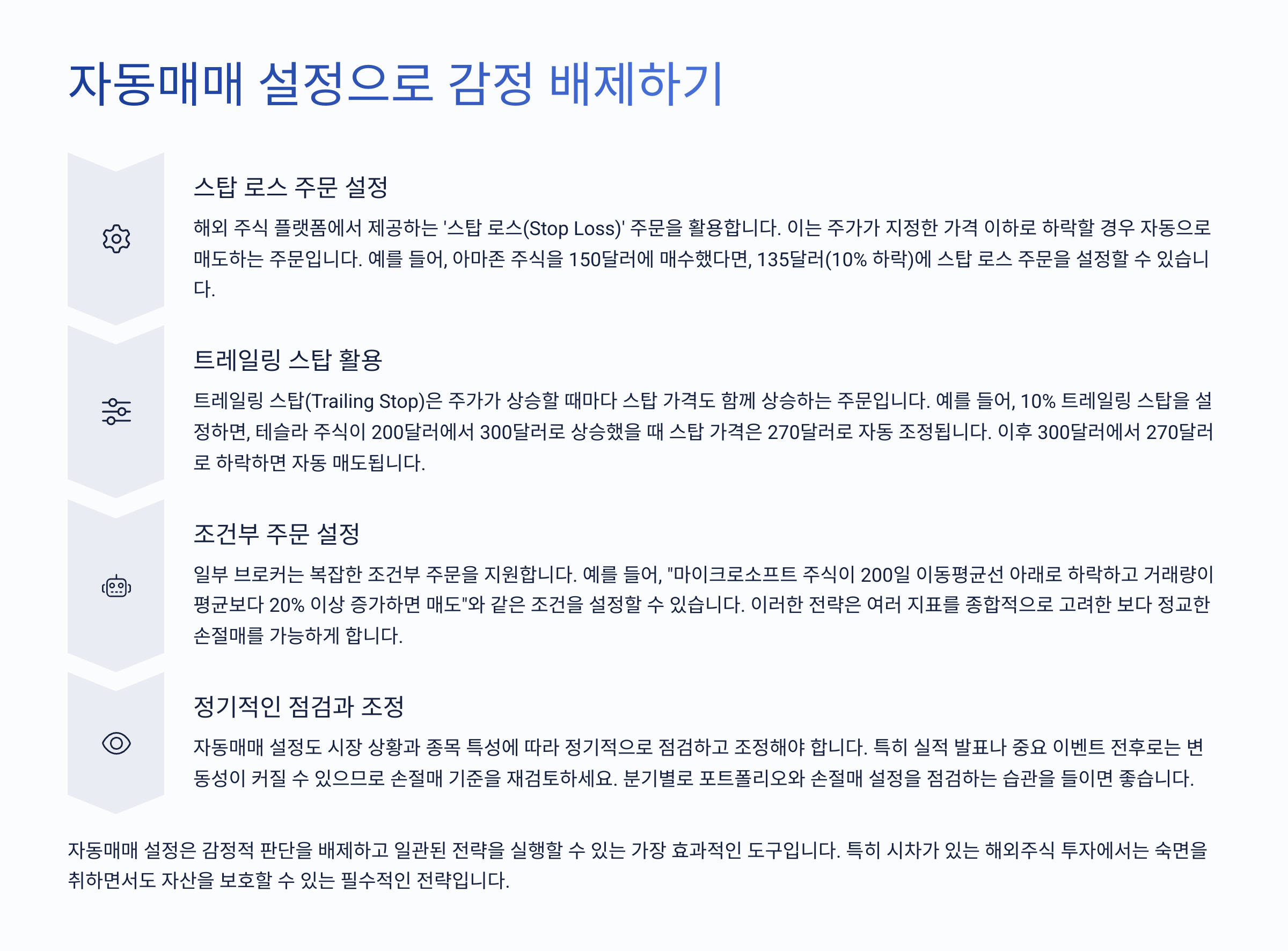 해외주식은 시차 때문에 장중 상황을 실시간으로 지켜보기 어렵잖아요? 이럴 때는 전일 종가 대비 손절 퍼센트를 정해두고 자동 설정하는 기능이 정말 유용해요. 또는 특정 지표가 이탈하면 자동 매도되도록 연동하는 API 서비스도 활용할 수 있어요.
