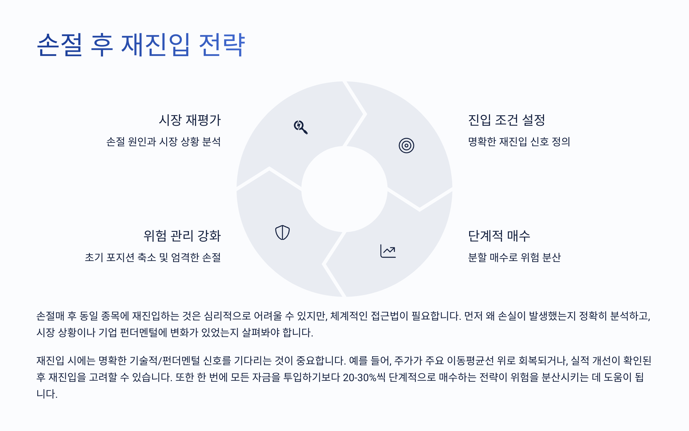 또는 완전히 다른 종목으로 옮겨가는 것도 하나의 전략이에요. 손절은 해당 종목의 추세가 망가졌다는 의미일 수 있으니까요. 꼭 다시 들어가야 할 이유가 없다면 더 좋은 종목을 찾는 것이 오히려 합리적인 선택일 수 있어요.
