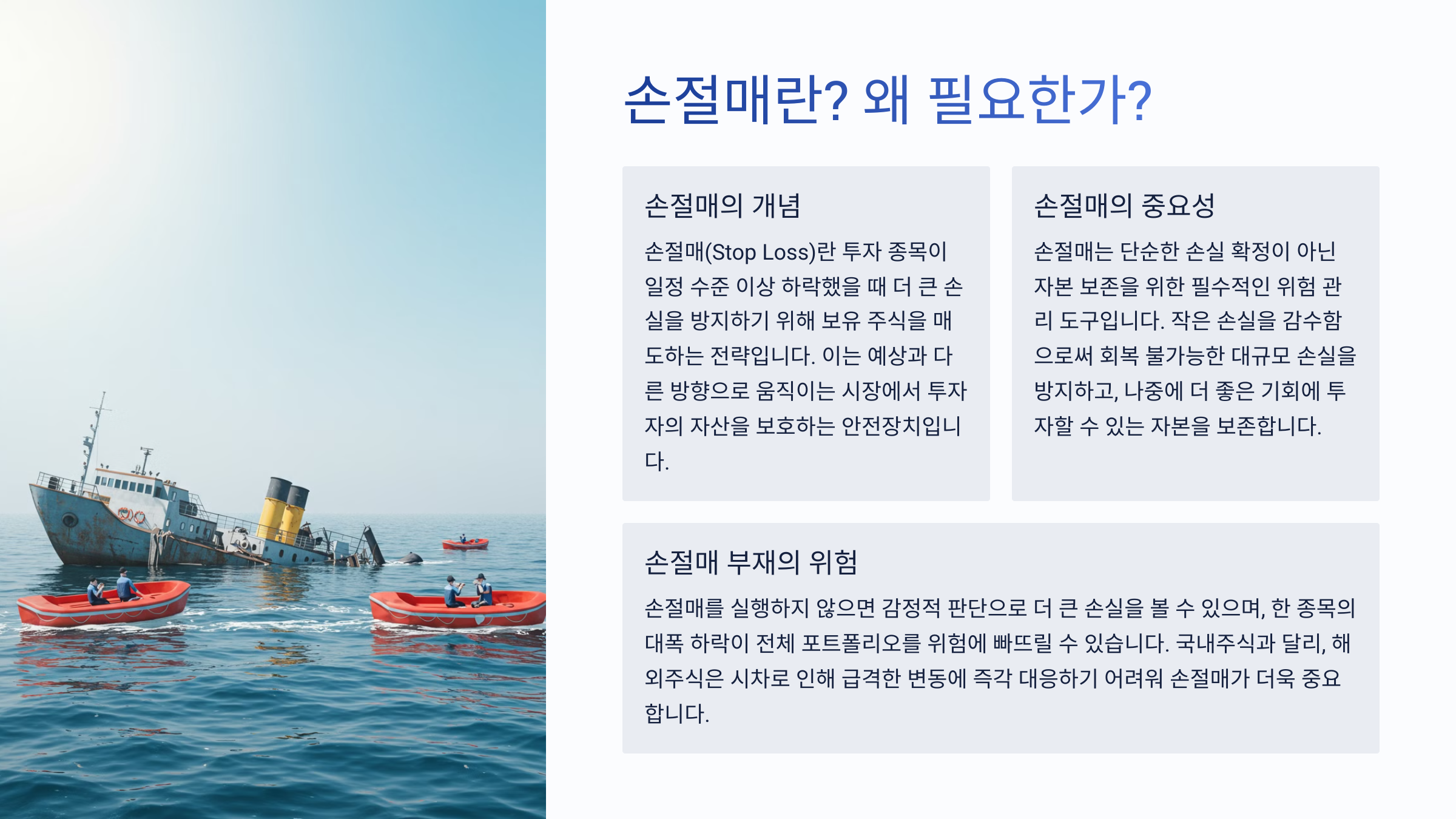 특히 해외주식은 예상치 못한 정책, 환율 급등락, 지연된 뉴스 반영 등으로 급격한 가격 변동이 자주 발생해요. 이럴 때 미리 정한 손절 기준이 없다면 공포 속에 잘못된 판단을 내릴 가능성이 높아요. 결국 손절은 리스크를 관리하는 가장 강력한 수단이죠.