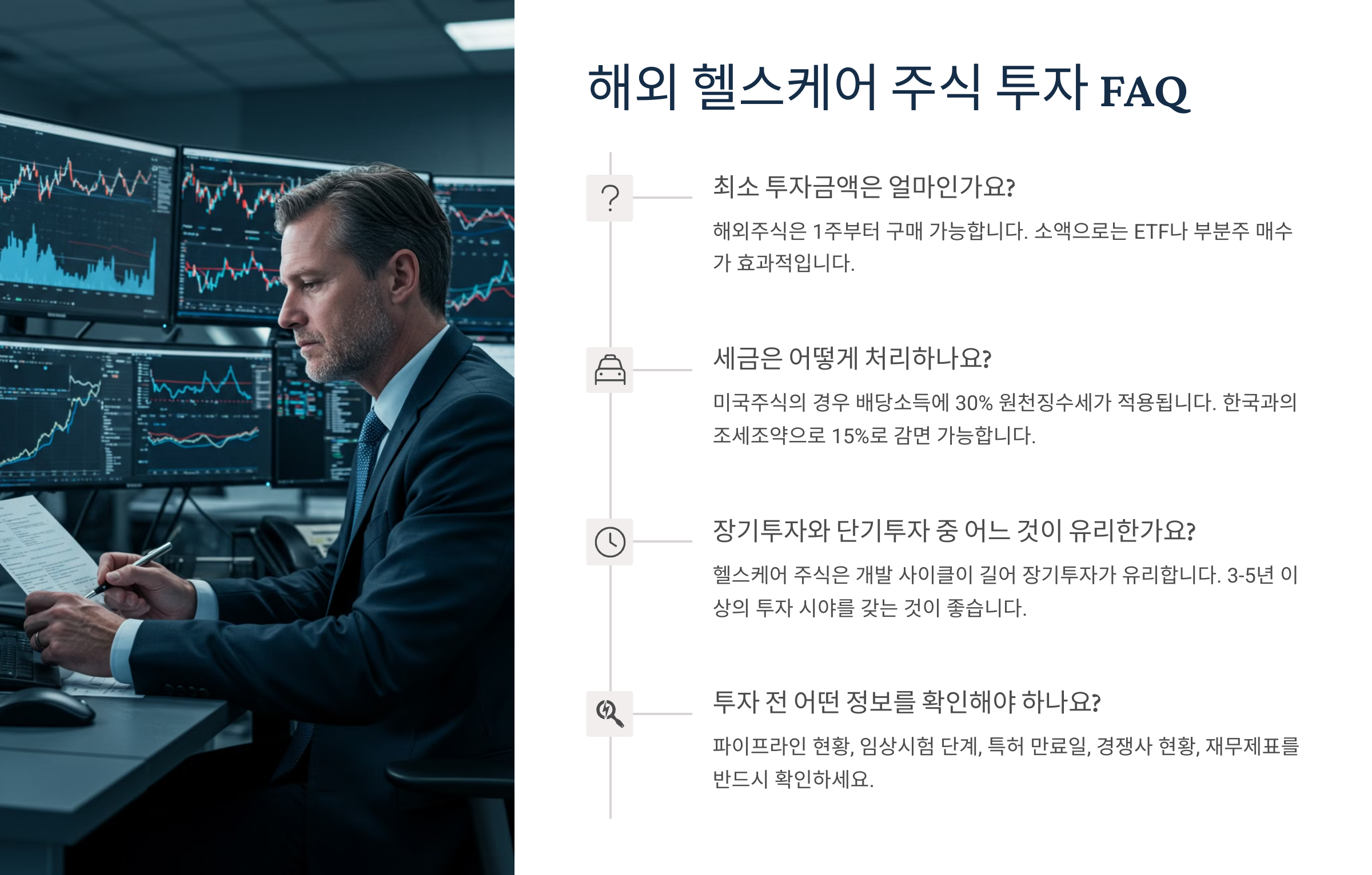 이처럼 제약·바이오주는 기대감이 크지만, 리스크도 분명히 존재해요. 투자 전에는 기술력, 재무 상태, 임상 단계, 글로벌 경쟁 구도까지 입체적으로 판단해야 해요. 지금부터는 사람들이 가장 많이 묻는 해외 헬스케어 주식 투자 FAQ를 정리해볼게요! 🧠📋