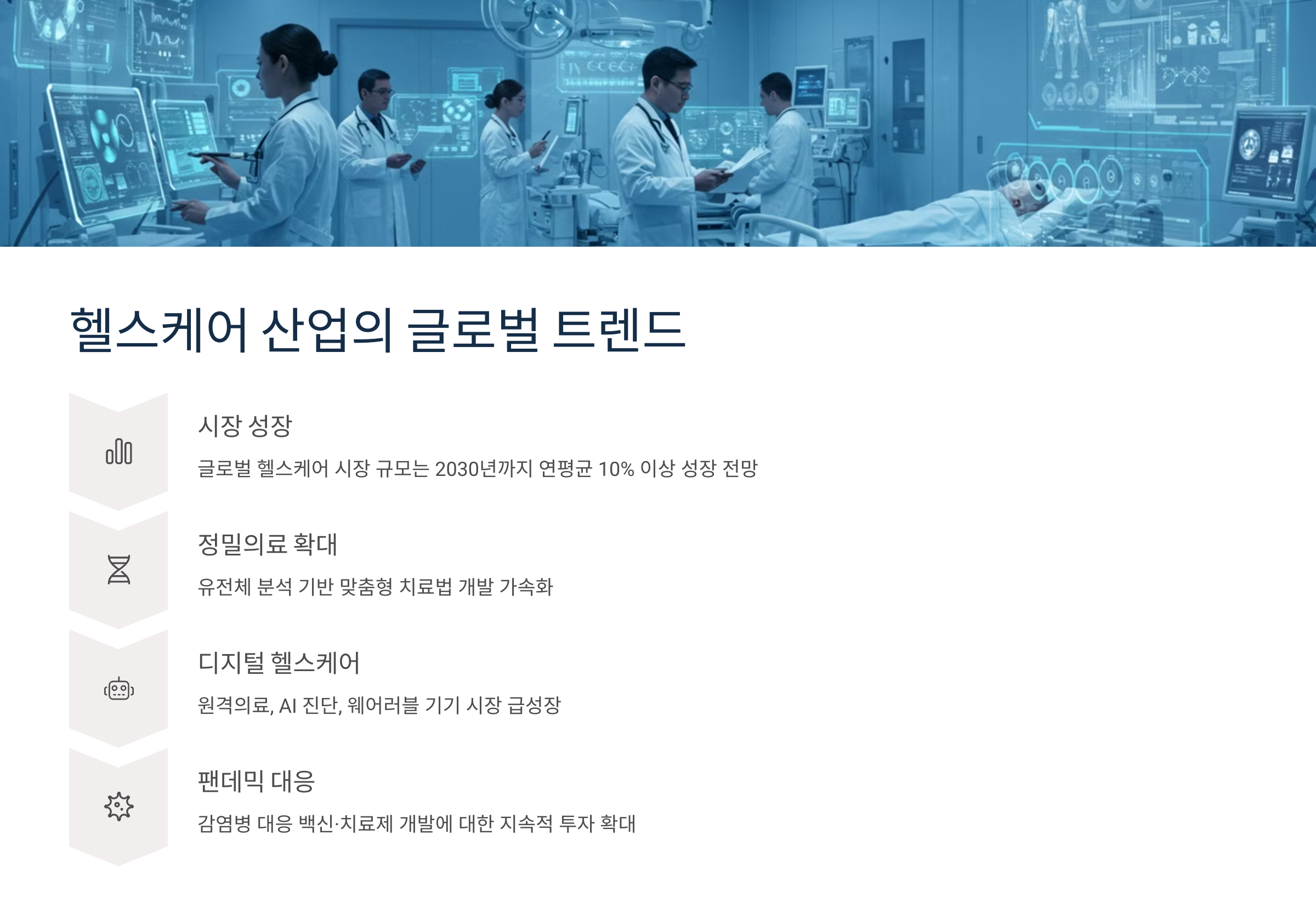전 세계적으로 헬스케어 산업은 그 어느 때보다 빠르게 확장 중이에요. 고령화, 감염병 확산, 만성질환 증가, 첨단 기술 융합이라는 네 가지 큰 흐름이 이 산업을 이끌고 있답니다. 특히 팬데믹 이후, 전 세계 투자자들이 헬스케어 분야를 재조명하게 되었죠.