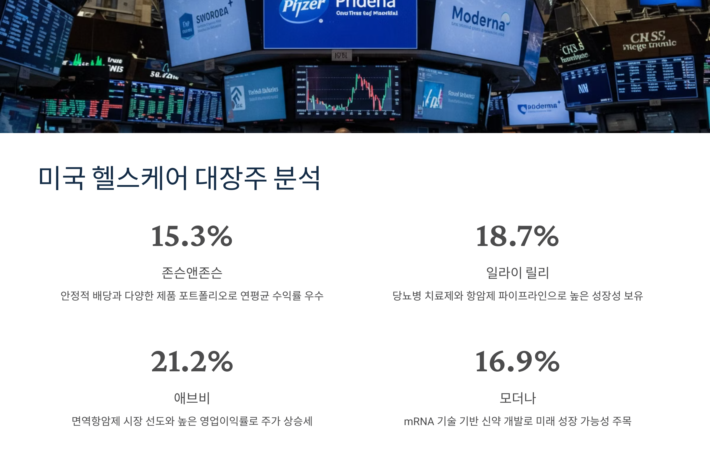 이제 다음은 헬스케어의 중심지, 미국 시장에서 어떤 대장주들이 있는지 분석해볼 차례예요. 🇺🇸💉