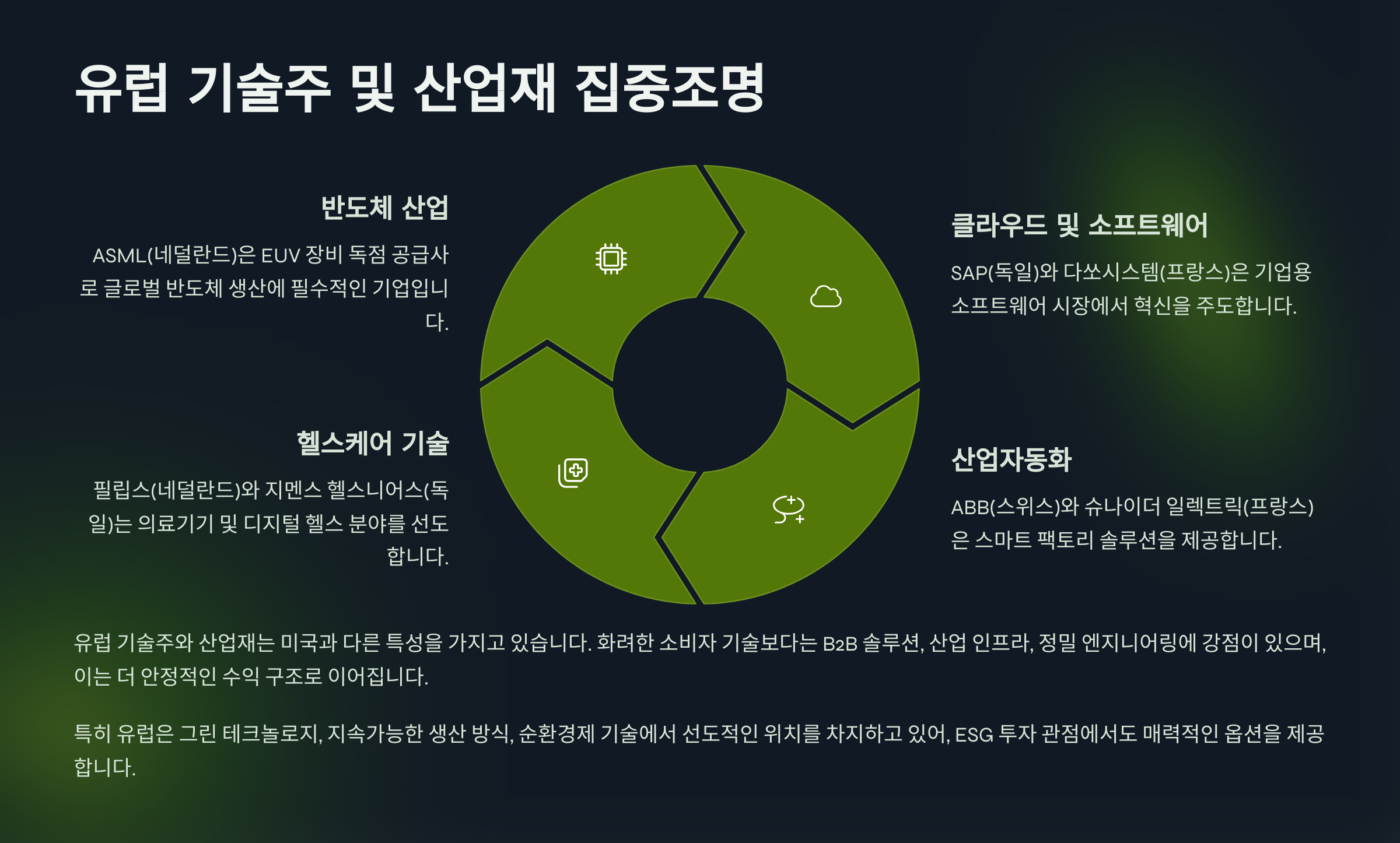 미래 산업 전환기에서 유럽 기술주는 무시 못 할 존재예요. AI, 반도체, 전력 자동화, 친환경 에너지 등 각 영역에서 탄탄한 수요 기반과 기술력을 가지고 있어요. 단기보다 중장기 성장성을 보는 투자자에게 딱이에요.
