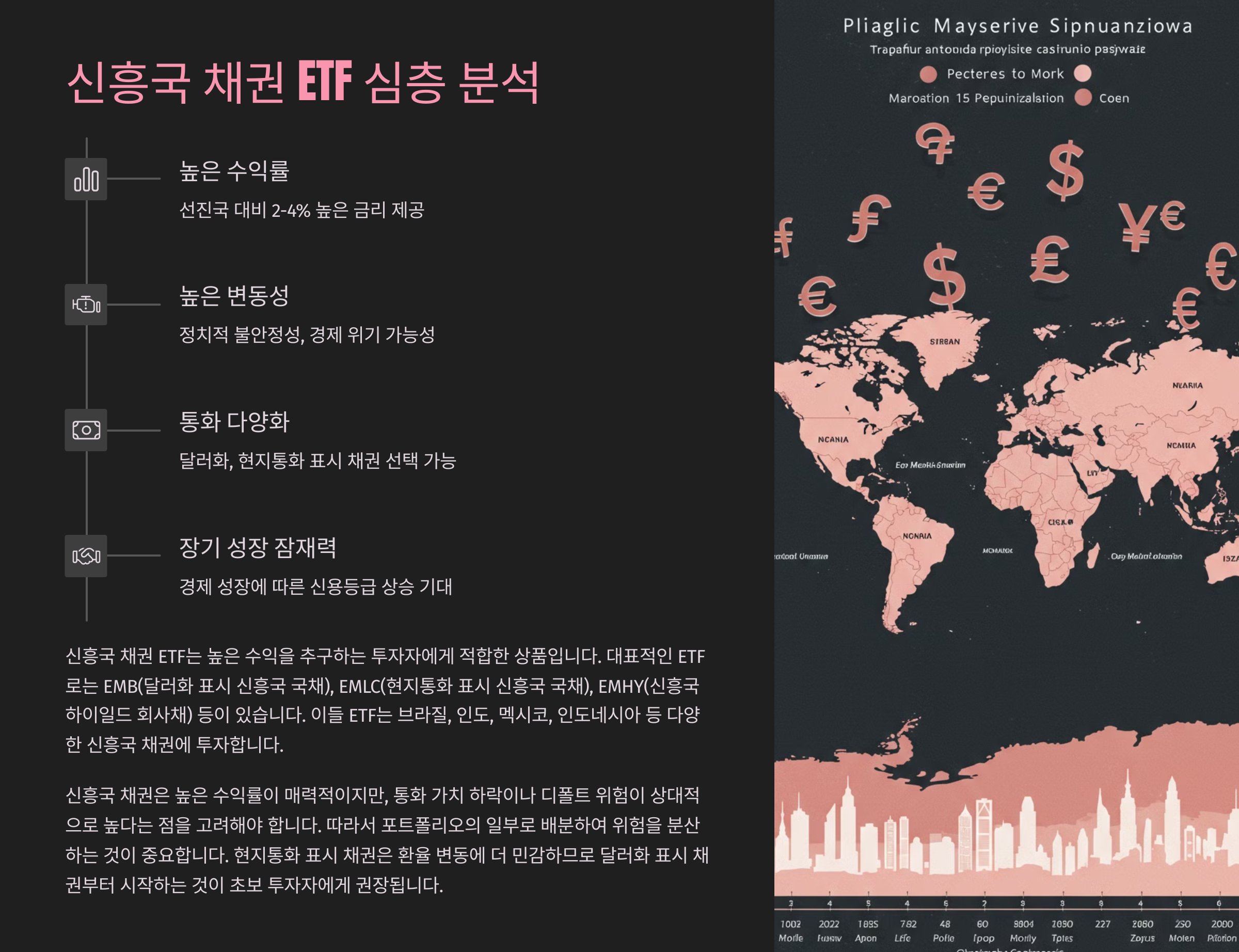 신흥국 채권 ETF는 고금리 매력이 있지만, 정치적·경제적 리스크가 높기 때문에 주의가 필요해요. 보통 브라질, 멕시코, 인도네시아, 남아공 등의 국채가 포함돼 있어요. 수익률은 미국 국채보다 높지만, 환율과 디폴트 위험이 상대적으로 더 커요.