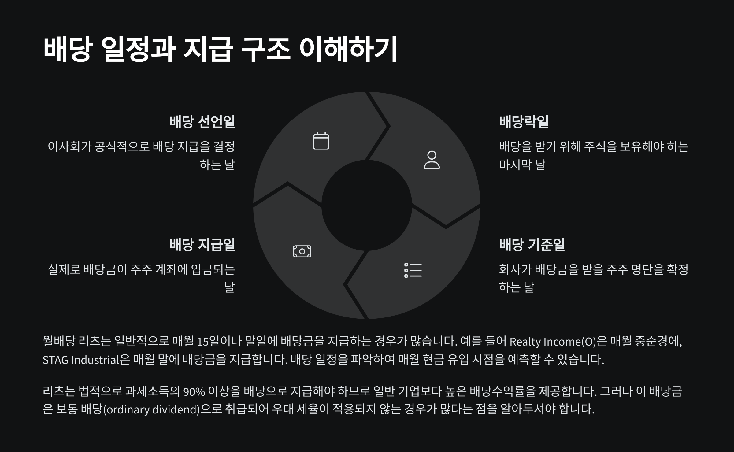 월배당 리츠들은 이런 일정을 매달 반복해요. 배당락일과 지급일은 보통 매월 10일~20일 사이에 형성돼요. 증권사 HTS나 종목 뉴스, 공식 IR 자료를 보면 미리 확인할 수 있어요. 리얼티 인컴(O)은 배당 지급일이 매달 15일 전후로 고정돼 있는 편이에요.