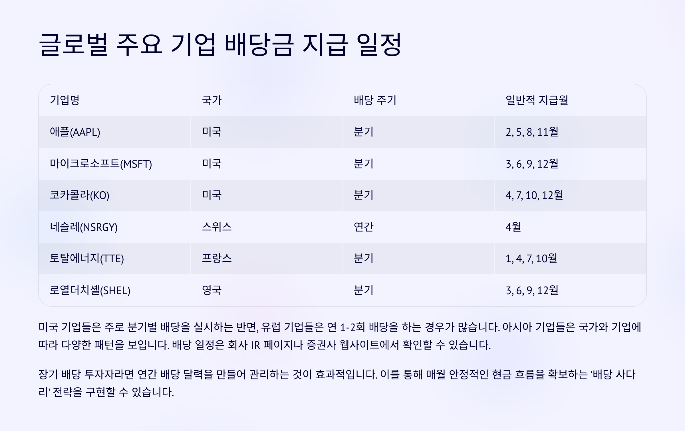 📢 "어떤 기업이 언제 배당금을 지급할까?" 💰 해외 주식 배당주는 **국가·기업마다 지급 일정이 다르기 때문에 정확한 일정 확인이 필수!** 📅