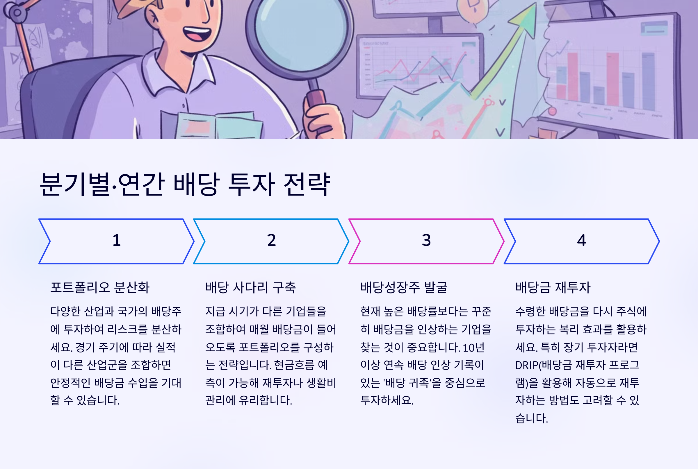 📢 "배당금을 더 많이 받으려면 어떤 전략이 필요할까?" 💰 단순히 배당주를 사는 것만으로는 부족해요! **분기별·연간 투자 전략을 활용하면 배당 수익을 극대화할 수 있어요.** 📊