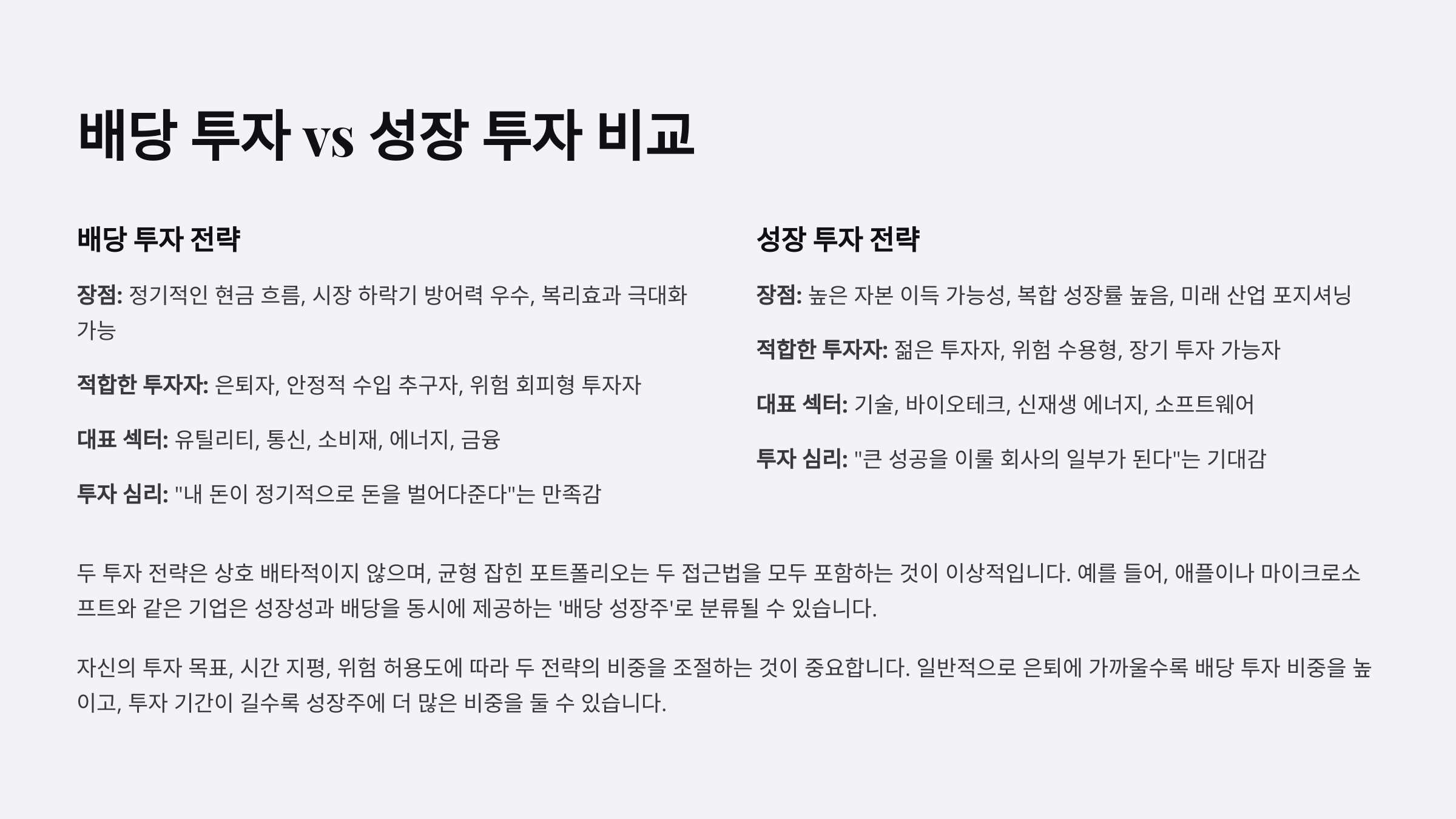 배당주에 투자하면서 이 세 가지를 체크하지 않으면 ‘숫자에 속는 투자’를 할 수 있어요. 숫자보다 중요한 건 그 숫자가 유지될 수 있는 '배경'이에요! 다음은 배당 투자와 성장 투자의 차이와 전략 비교예요 💼