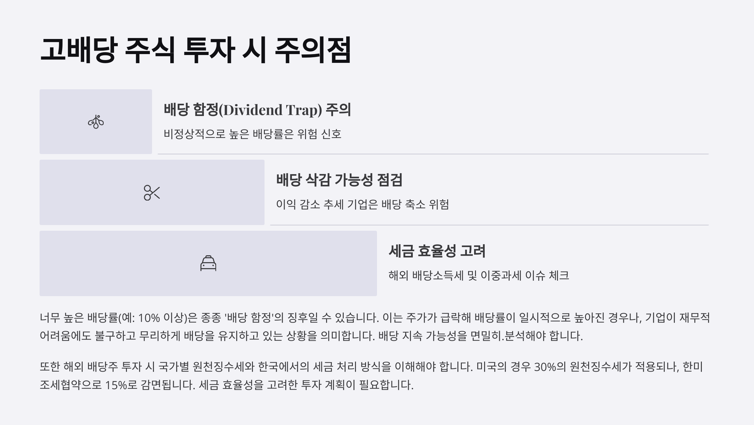 고배당 종목은 안정적인 수익을 주는 매력적인 투자처지만, 잘못 접근하면 손해를 볼 수도 있어요. 배당만 보고 덜컥 투자하면 ‘배당 함정’에 빠지기 쉬워요. 그래서 몇 가지 꼭 체크해야 할 위험 요소들이 있어요.