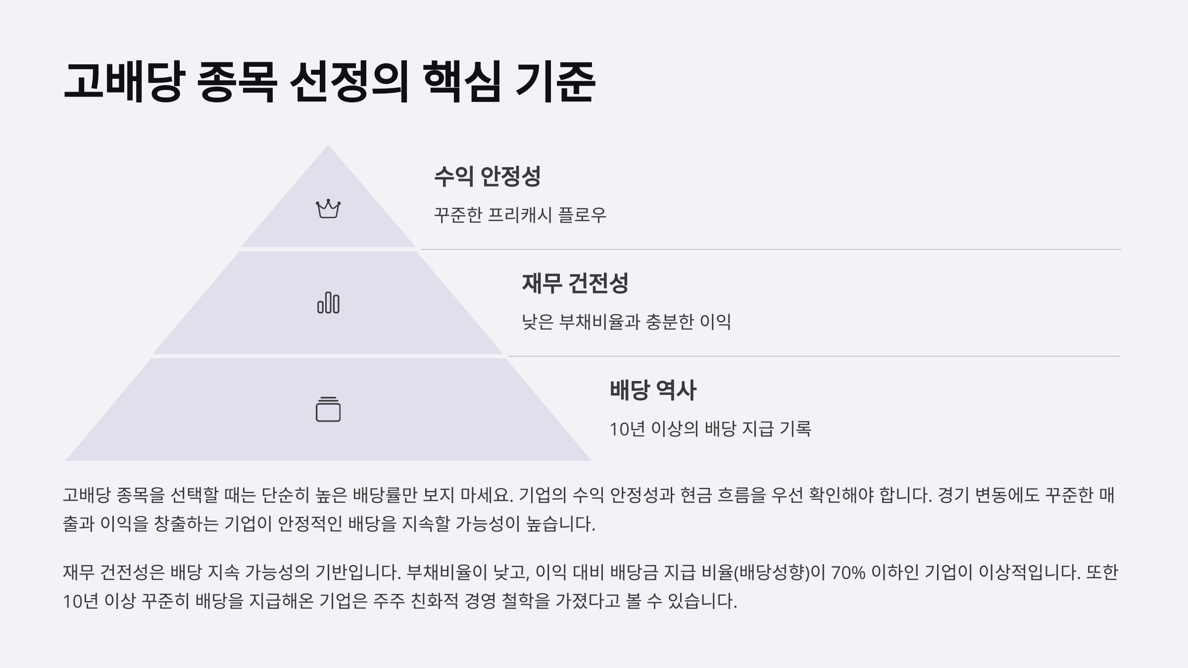고배당 투자의 핵심은 ‘얼마나 높냐’보다 얼마나 오래 지급하느냐에 달려 있어요. 배당이 한두 번 높게 나왔다가 끊기면 오히려 손해일 수 있거든요. 그래서 배당의 ‘지속 가능성’을 판단하는 게 정말 중요해요.