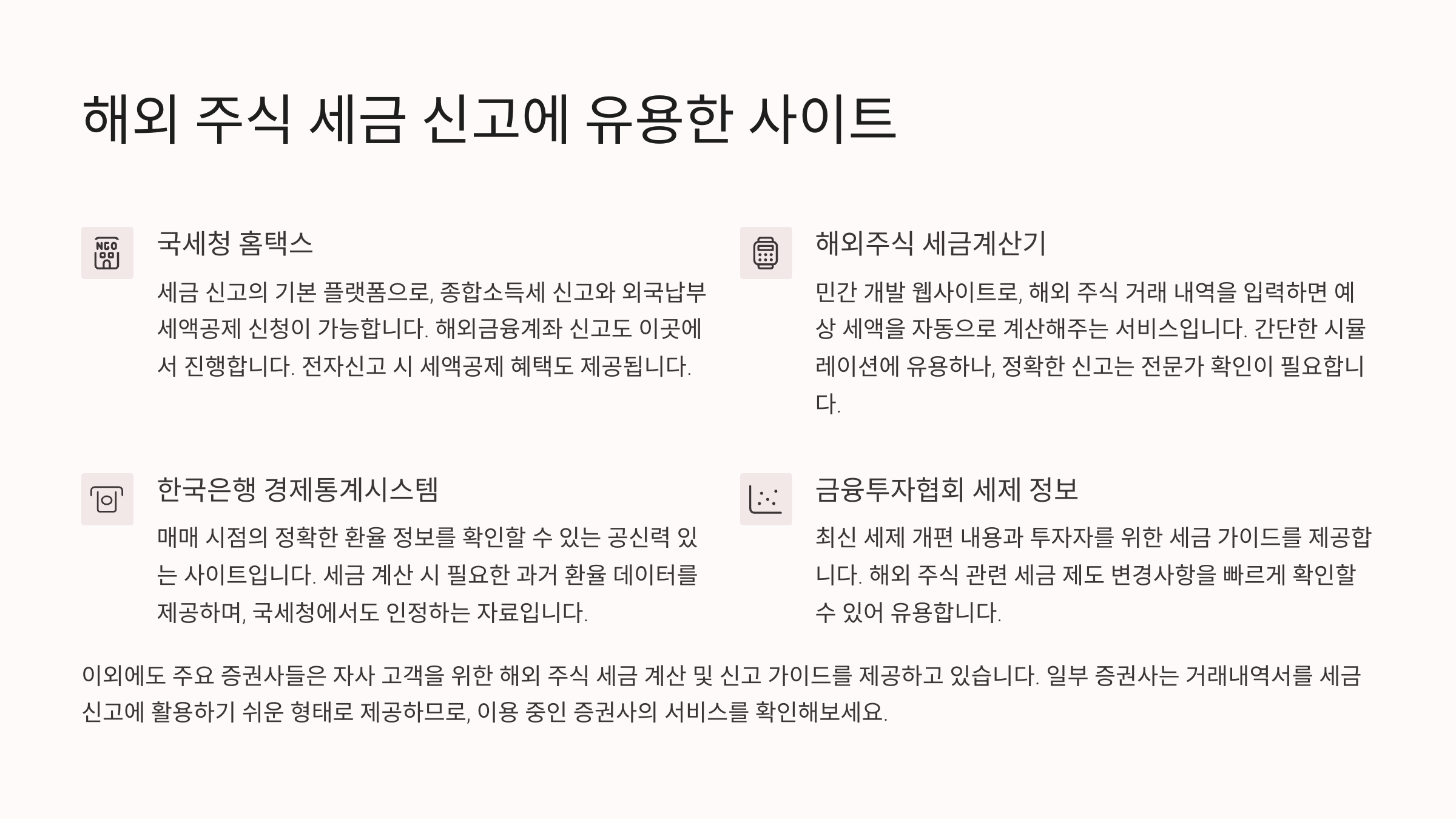 해외 주식 세금 신고를 할 때 필요한 정보와 서비스를 제공하는 유용한 사이트들이 있어요. 세금 계산, 신고, 환율 조회 등 다양한 기능을 활용하면 훨씬 편리해요! 🌐
