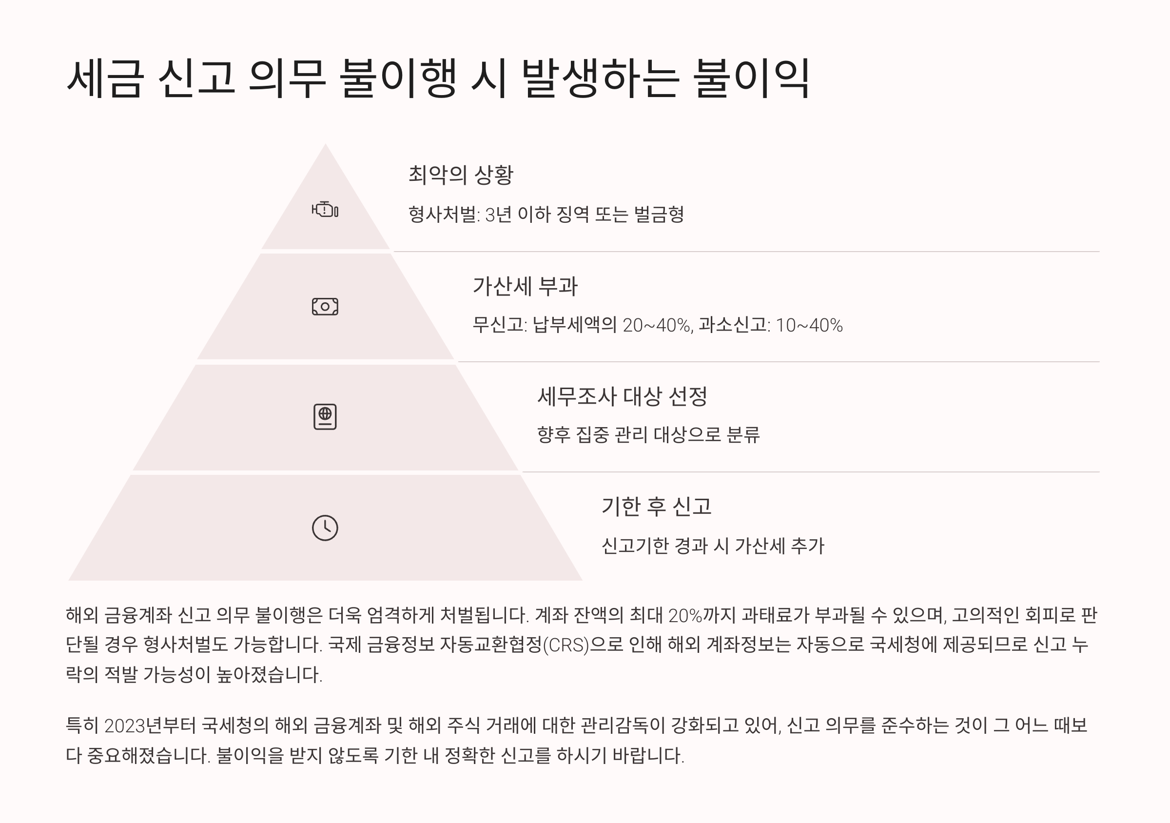 • 💰 가산세 부과: 신고하지 않으면 기본 세금 외에 최대 40%의 가산세가 붙을 수 있어요.
