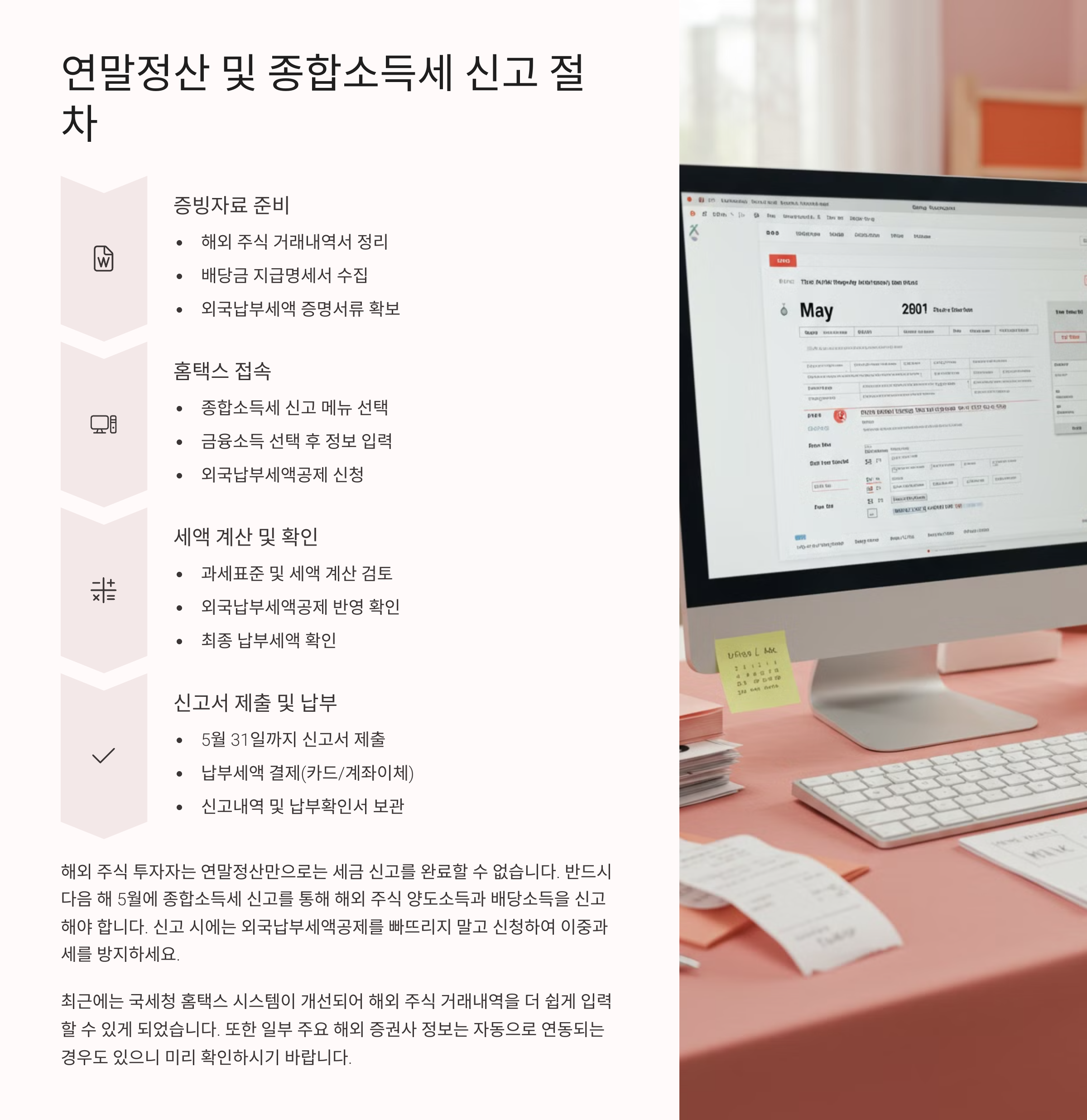 해외 주식 투자자는 연말정산 또는 종합소득세 신고를 통해 세금을 정산해야 해요. 신고 절차를 정확히 알아두면 불필요한 세금 부담을 줄일 수 있어요! 📝