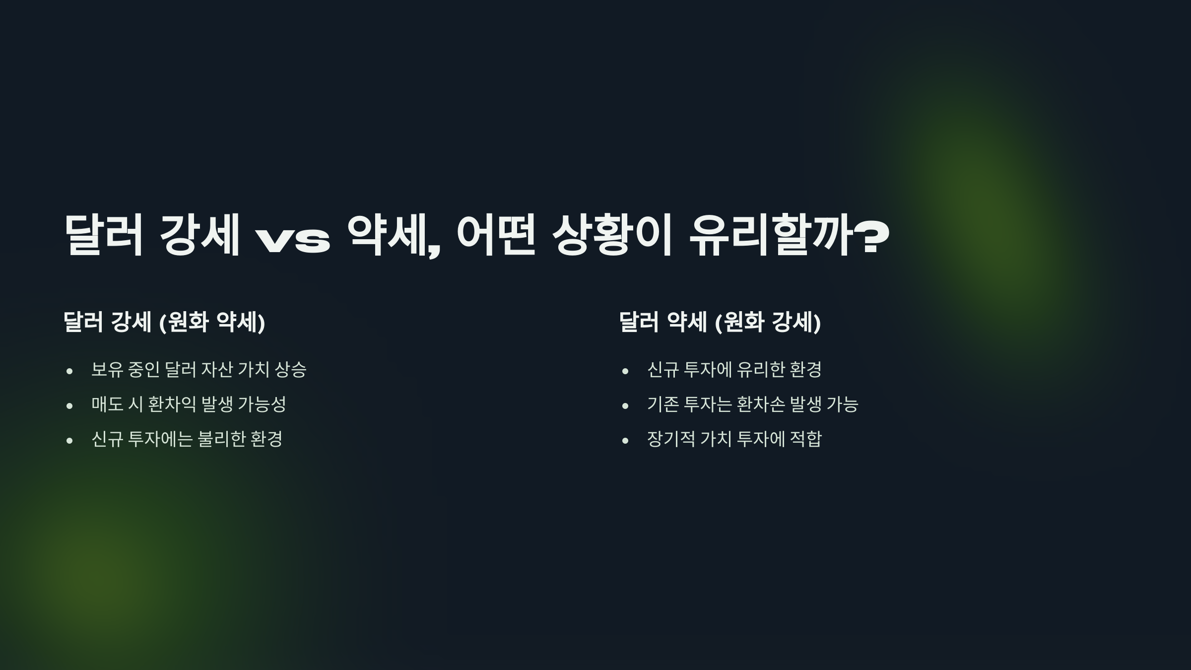 그럼, 달러 강세와 약세 중 어떤 상황이 해외 주식 투자에 유리할까요? 🤔