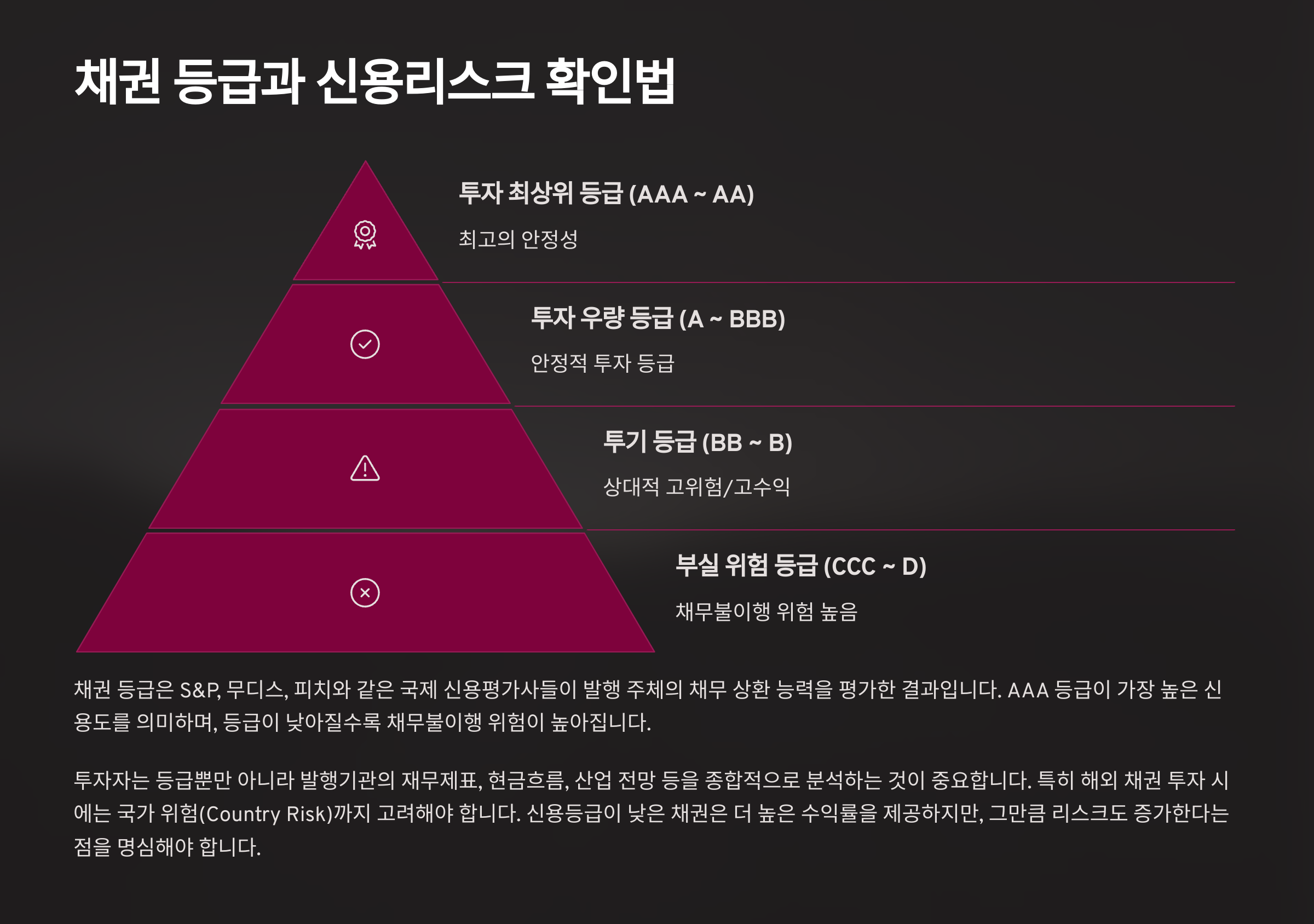 안정성을 우선한다면 AAA~A등급, 수익률을 우선한다면 BBB~BB 등급의 고수익 채권을 고려해볼 수 있어요. 하지만 신흥국 채권이나 회사채는 등급이 낮을수록 신중히 접근해야 해요. 🧠