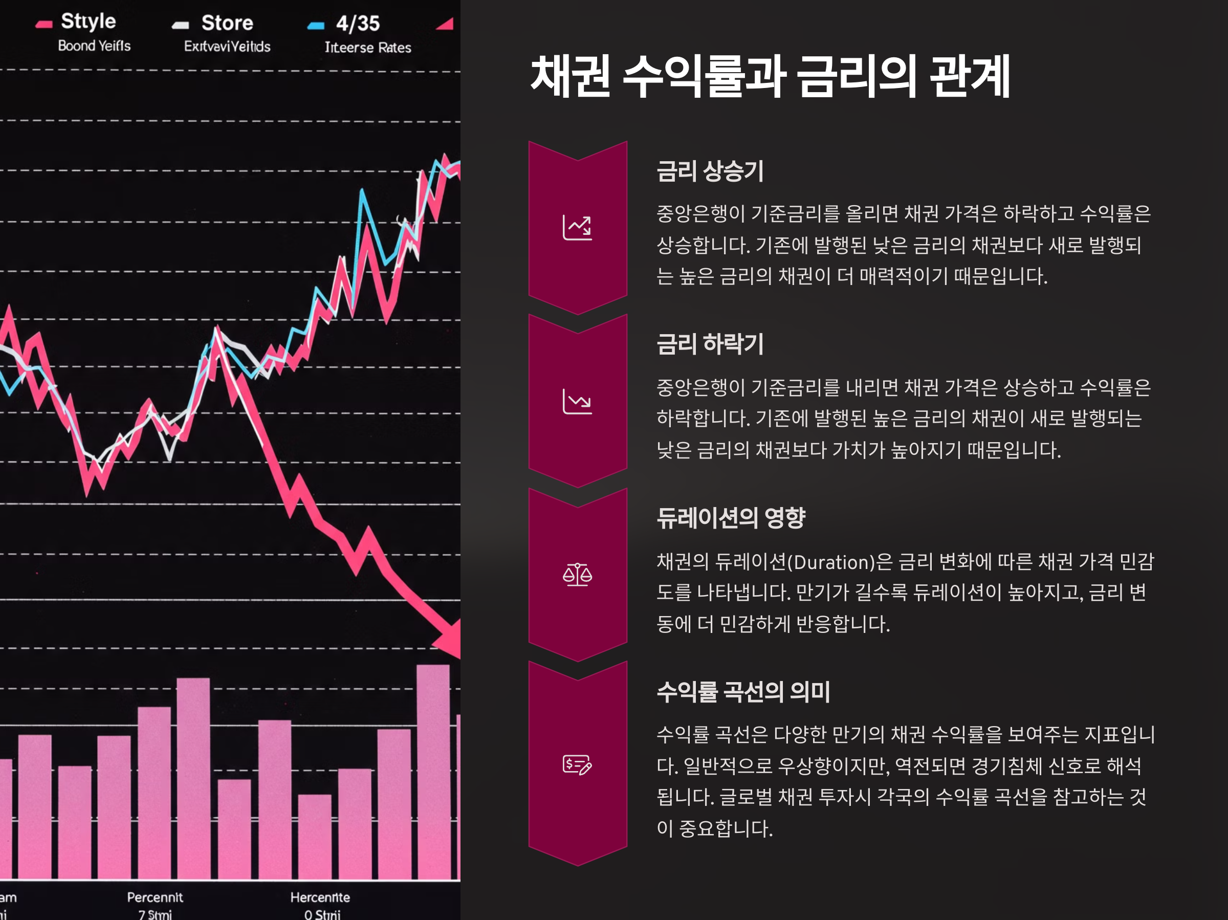 해외 채권은 성격이 뚜렷해서 목적에 따라 고를 수 있어요. 안정성 위주면 미국 국채, 수익률 추구는 회사채나 신흥국 채권으로 포트폴리오를 조합하면 좋아요. 다음 섹션에선 수익률을 결정짓는 핵심, 금리와의 관계를 파헤쳐볼게요!