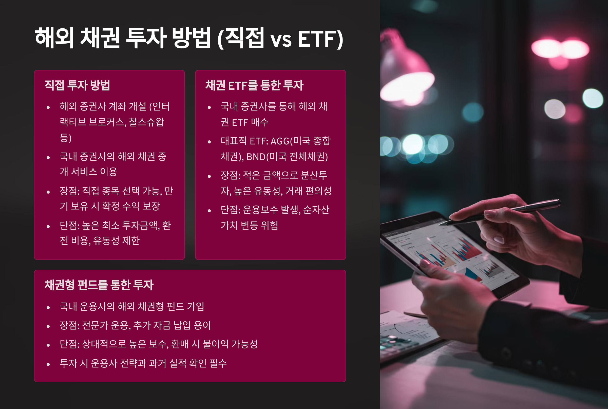 해외 채권 투자는 생각보다 다양하게 할 수 있어요. 직접 채권을 사서 만기까지 보유할 수도 있고, ETF(상장지수펀드)를 통해 여러 채권에 분산 투자할 수도 있어요. 각각 장단점이 뚜렷하기 때문에, 투자 목적에 따라 선택하는 게 중요해요.