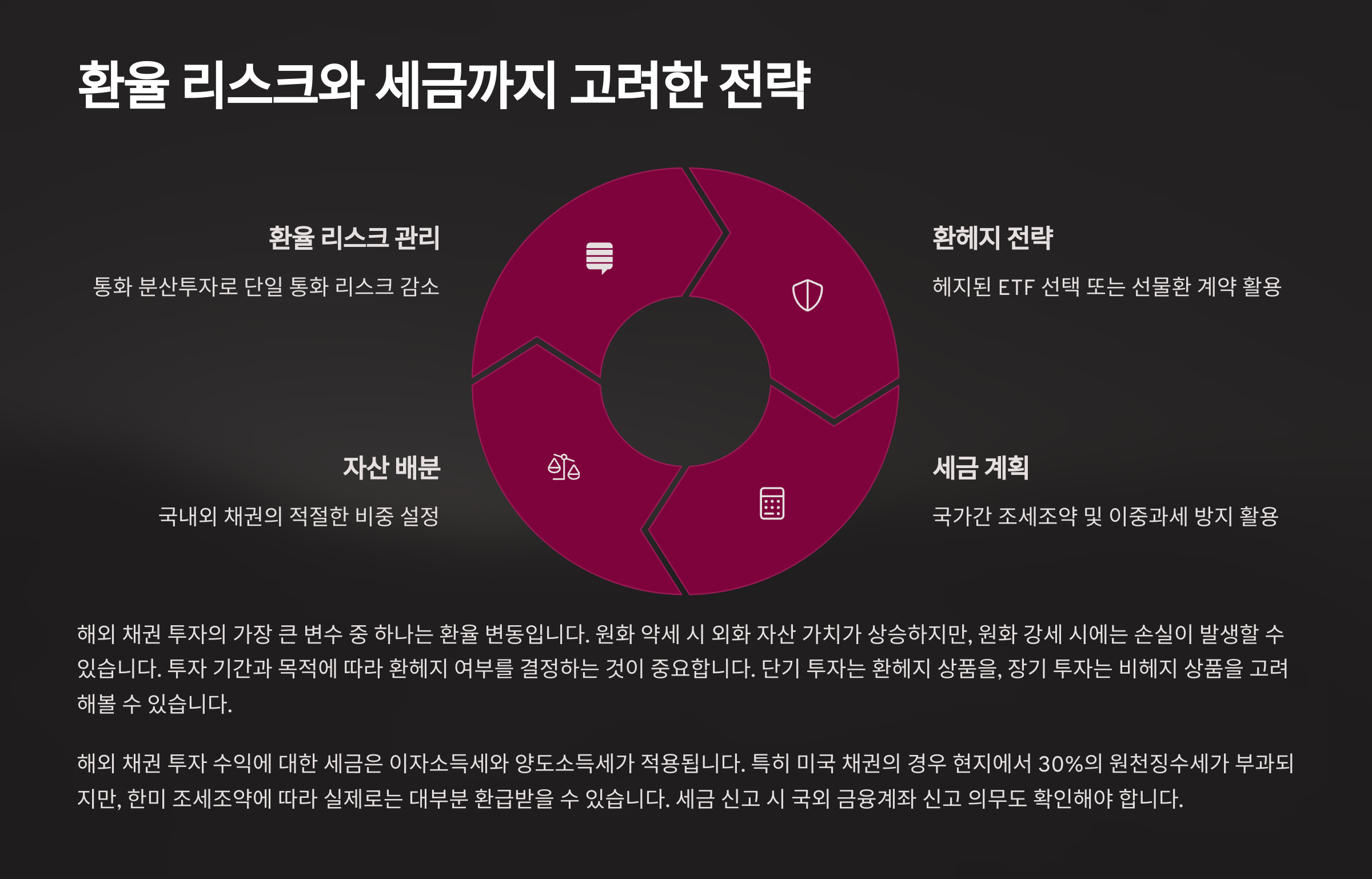 해외 채권 투자의 실제 수익률을 결정짓는 마지막 퍼즐은 바로 환율과 세금</strong이에요. 이 두 가지를 고려하지 않으면 이자 수익을 받아도 실제 내 통장에 찍히는 금액은 기대보다 작을 수 있어요. 꼭 알고 투자해야 할 핵심 포인트죠.