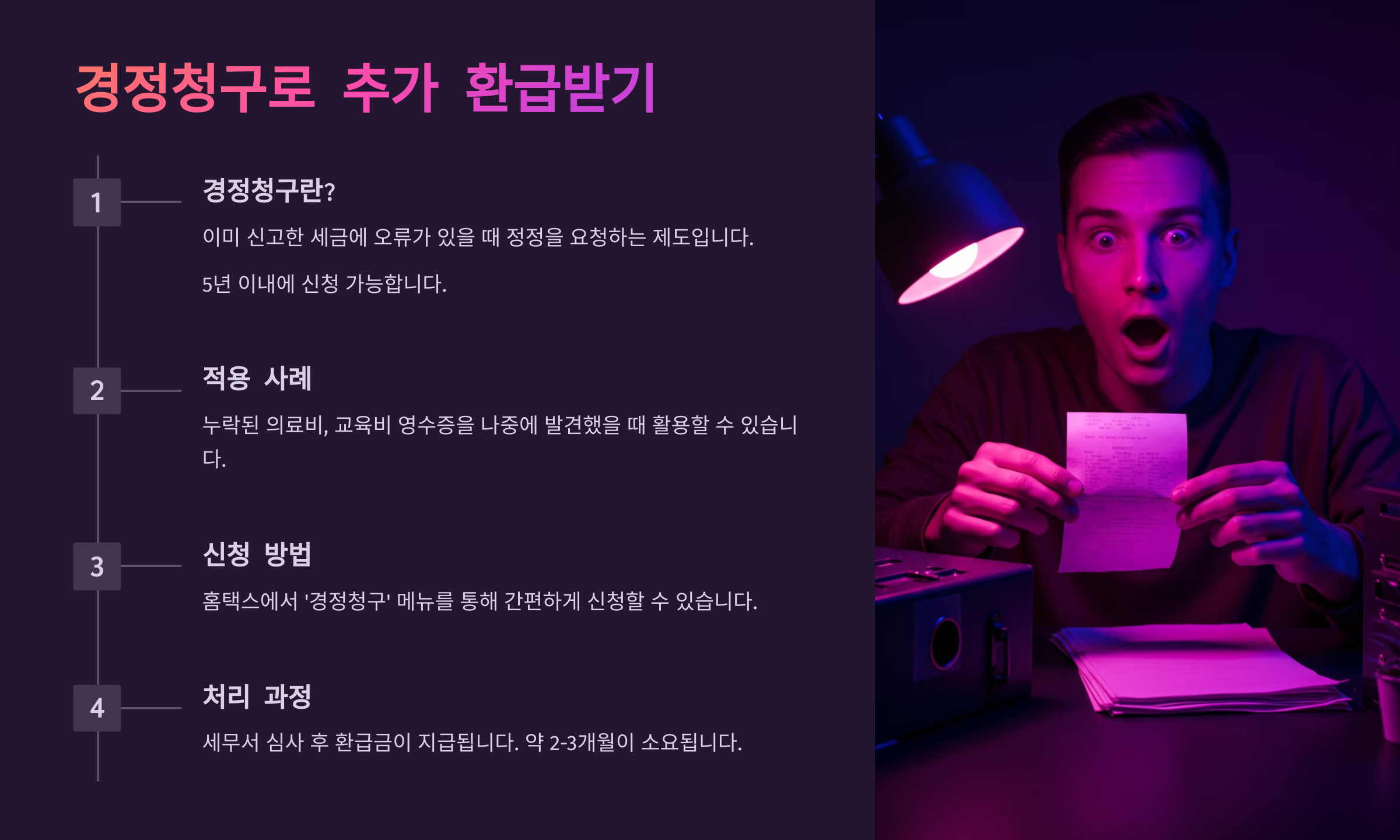 - 📌 4단계: 누락된 공제 항목이 있다면 **경정청구를 통해 추가 환급**받을 수 있다.
