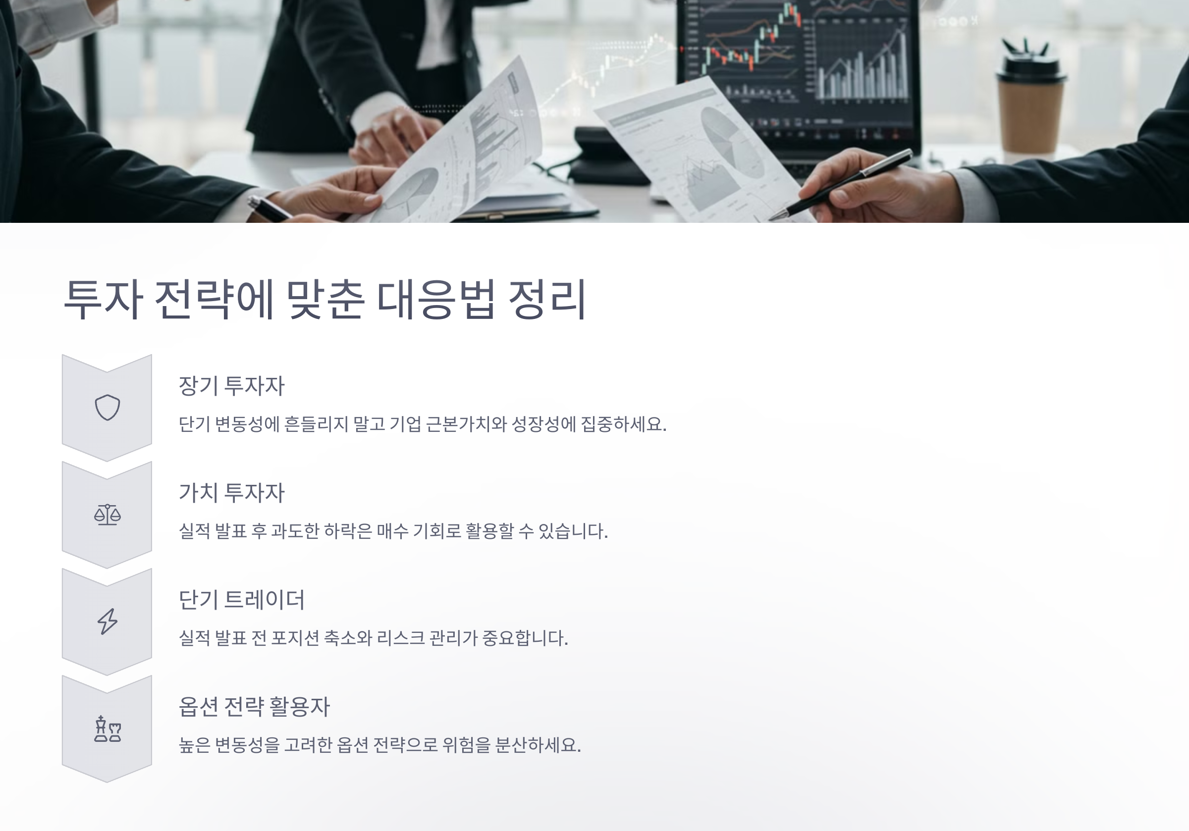 이런 흐름을 잘 이해하고 있으면, 단순히 ‘예상보다 좋았다 vs 나빴다’로 반응하는 게 아니라 ‘언제 매수하고 언제 매도할지’ 판단하는 데 도움이 많이 돼요! 다음 섹션에서는 투자 전략에 맞춘 실적 시즌 대응법을 알려드릴게요! 🧠