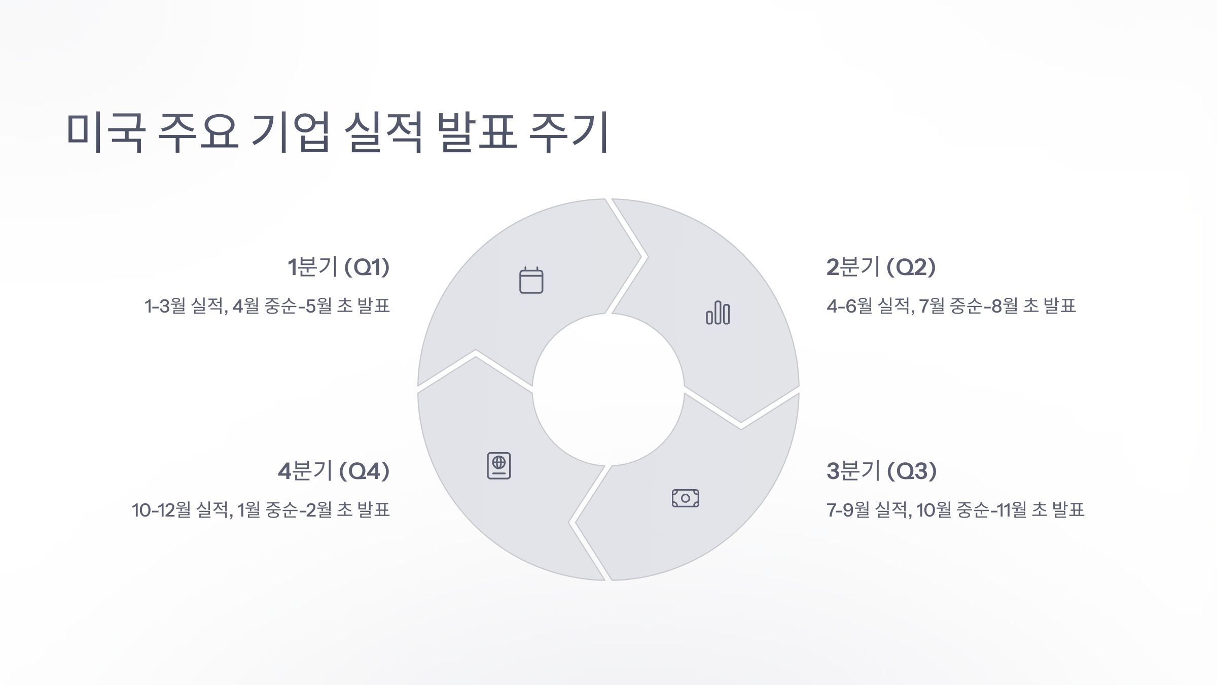 미국 주식시장에서 대부분의 기업은 분기 실적 발표를 기준으로 투자자들에게 성과를 공개해요. 연간으로는 4회, 각각 1분기부터 4분기까지 나눠서 실적이 발표되고, 이 일정은 미국 회계연도 기준으로 관리돼요.