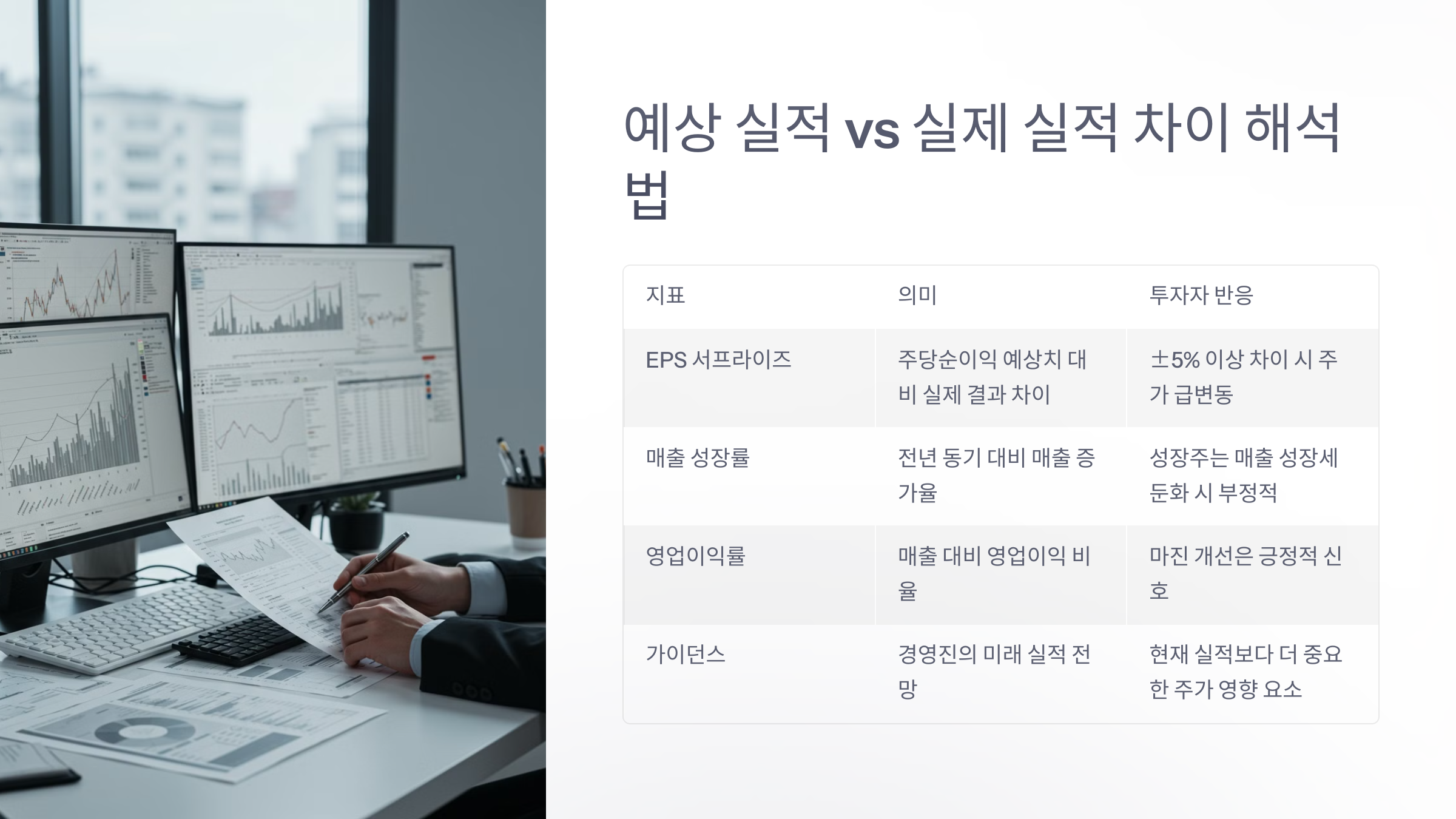 실적 시즌에서 주가를 결정짓는 가장 중요한 포인트는 바로 예상 실적과 실제 실적의 차이예요. 단순히 매출이 얼마였는지가 중요한 게 아니라, '시장 기대치'를 넘었는지가 주가의 방향을 결정하죠.
