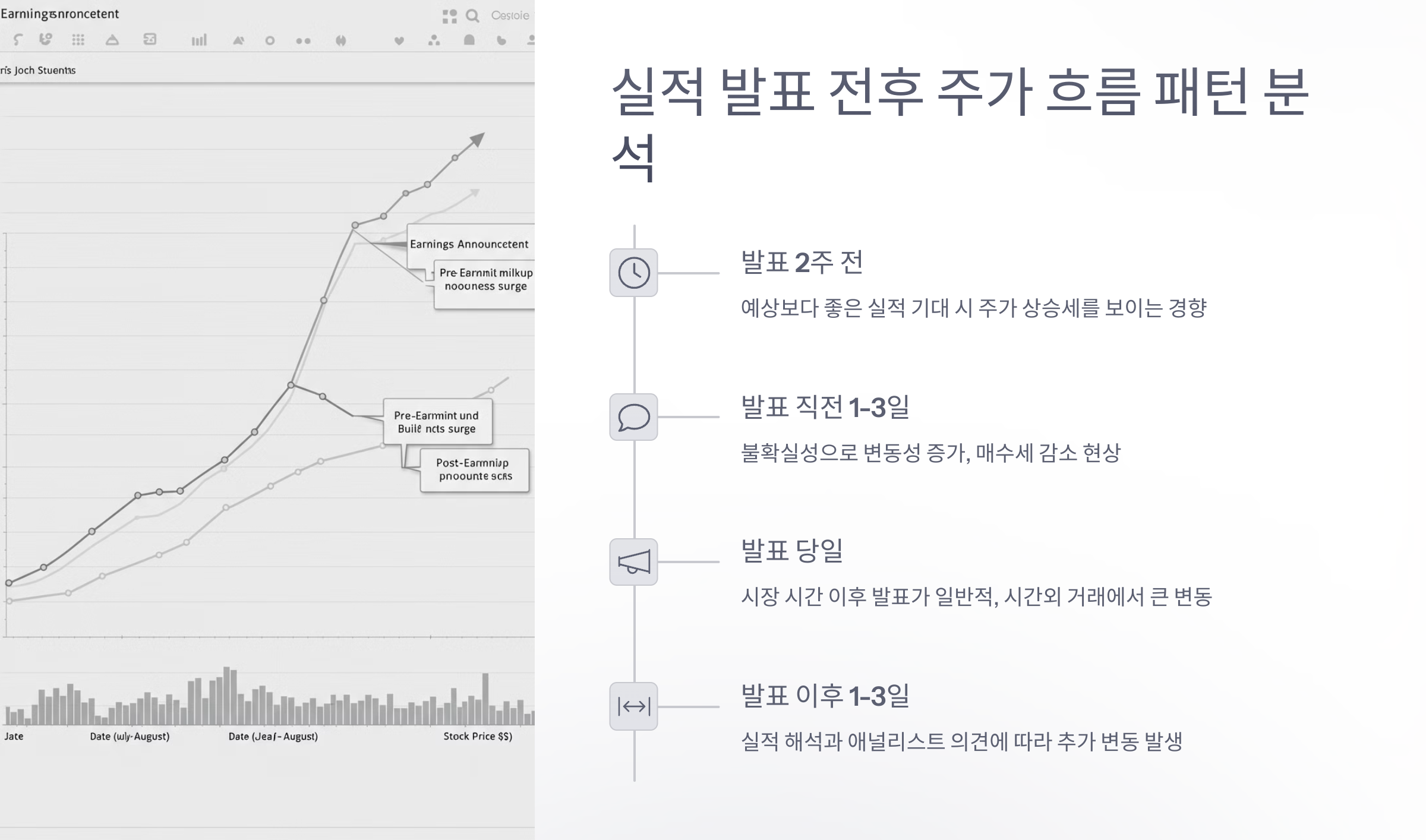 실적 발표는 숫자 싸움이 아니에요. 기대와 현실의 간극을 읽고, 시장의 심리를 파악하는 게 핵심이에요. 다음 섹션에서는 실적 발표 '전후'에 주가가 어떻게 움직이는지, 그 흐름 패턴을 분석해드릴게요! 📉📈