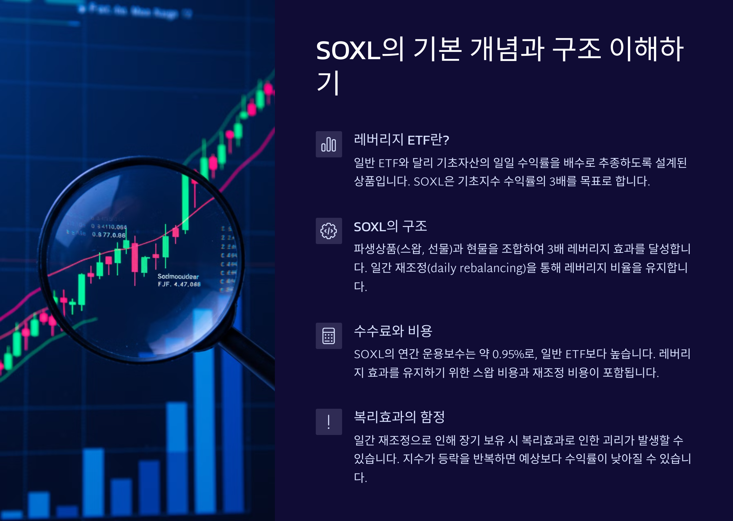 하지만 SOXL은 일반 ETF와는 다르게 레버리지를 활용하기 때문에, 단순히 "좋아 보인다"는 이유만으로 투자하기엔 위험이 따르기도 해요. 그래서 이 글에서는 SOXL의 구조부터 진입 타이밍, 수익 전략까지 낱낱이 파헤쳐볼게요. 📊