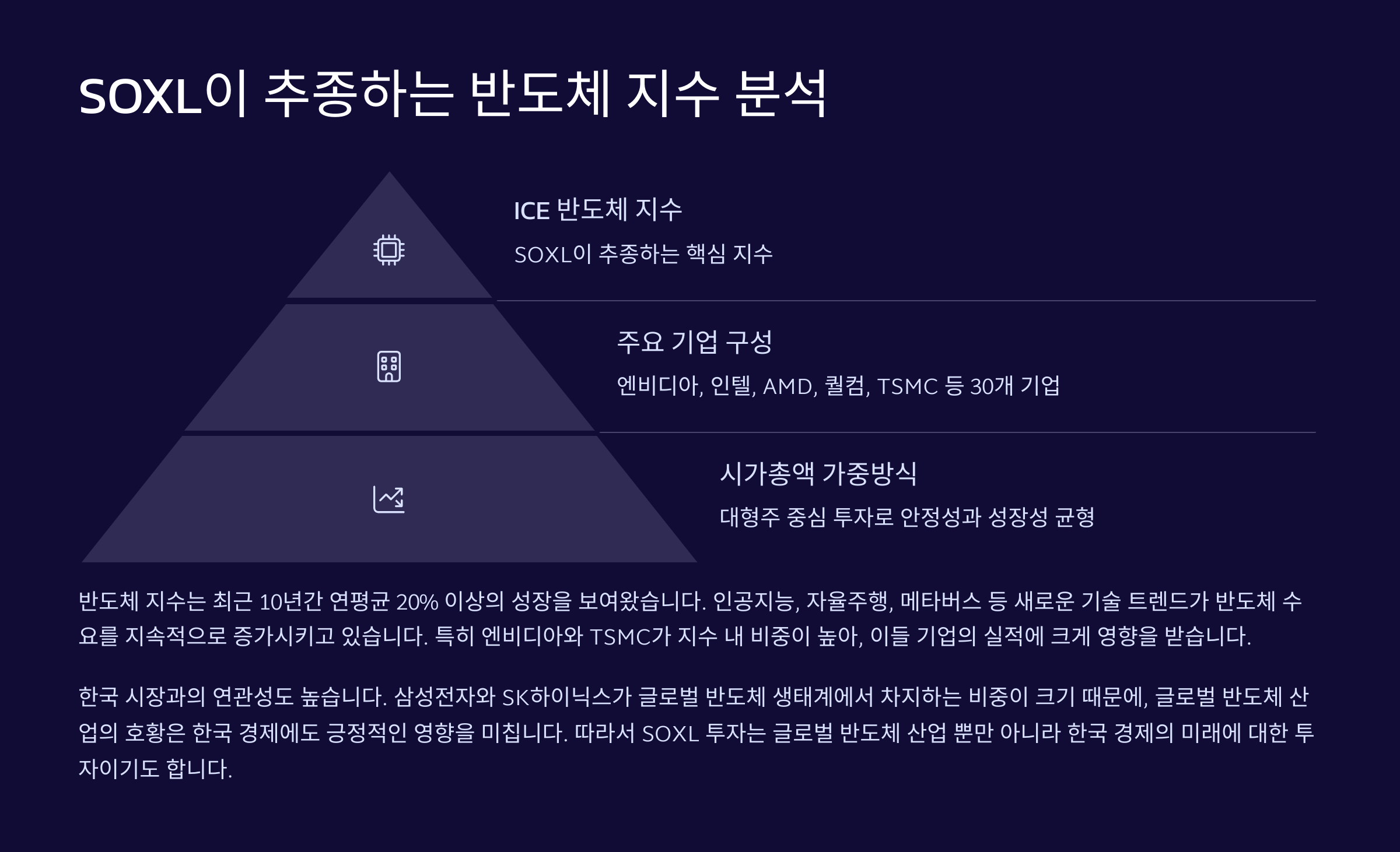 SOXL은 'PHLX Semiconductor Sector Index(SOX)'라는 지수를 3배로 추종해요. 이 지수는 필라델피아 거래소에서 개발한 반도체 섹터 지수로, 미국 상장 반도체 기업 중 시가총액과 거래량 등을 고려해 30개 안팎의 종목으로 구성돼 있어요. 주요 구성 종목에는 NVIDIA, AMD, QUALCOMM, Intel, Texas Instruments 등이 있어요.