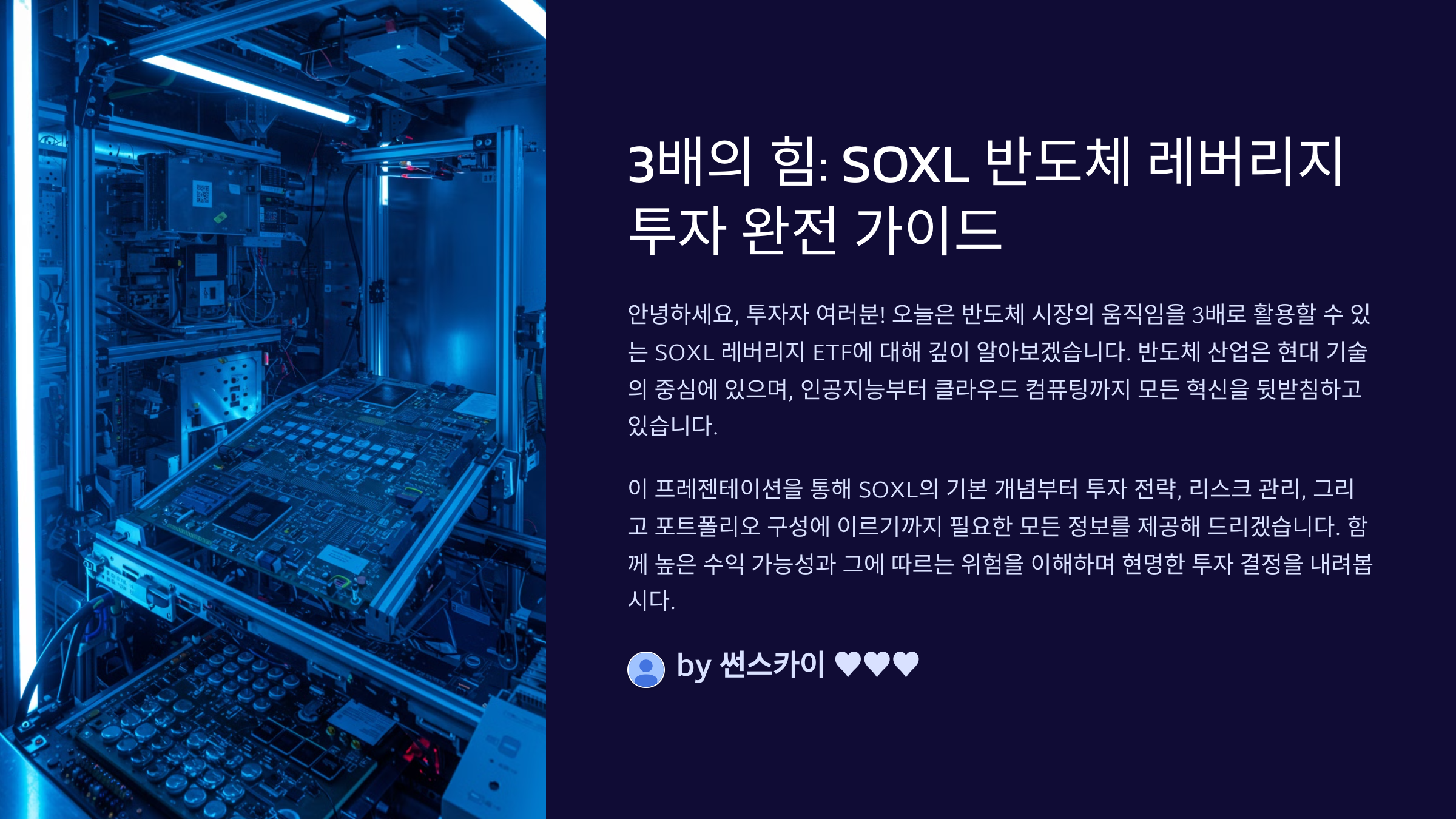 반도체 시장이 폭발적인 성장을 거듭하면서, 이에 3배 수익을 추구하는 ETF인 SOXL이 큰 주목을 받고 있어요. 요즘처럼 인공지능, 자율주행, 클라우드 컴퓨팅이 뜨거운 시대엔 반도체가 핵심 기술로 자리잡고 있기 때문에 SOXL의 인기도 그만큼 높아지는 거죠.