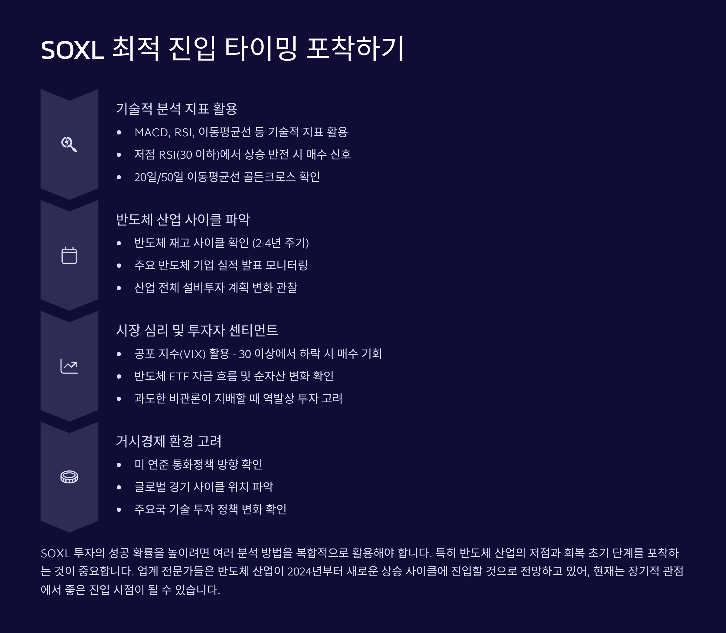 SOXL은 타이밍이 생명이에요. 단순히 주가가 떨어졌다고 해서 무조건 매수하는 건 위험해요. 핵심은 반도체 업황이 바닥에서 반등하는 시점을 파악하는 것이죠. 특히 전방 산업인 스마트폰·PC 수요, AI·서버 수요가 회복될 때가 핵심 진입 타이밍이에요.