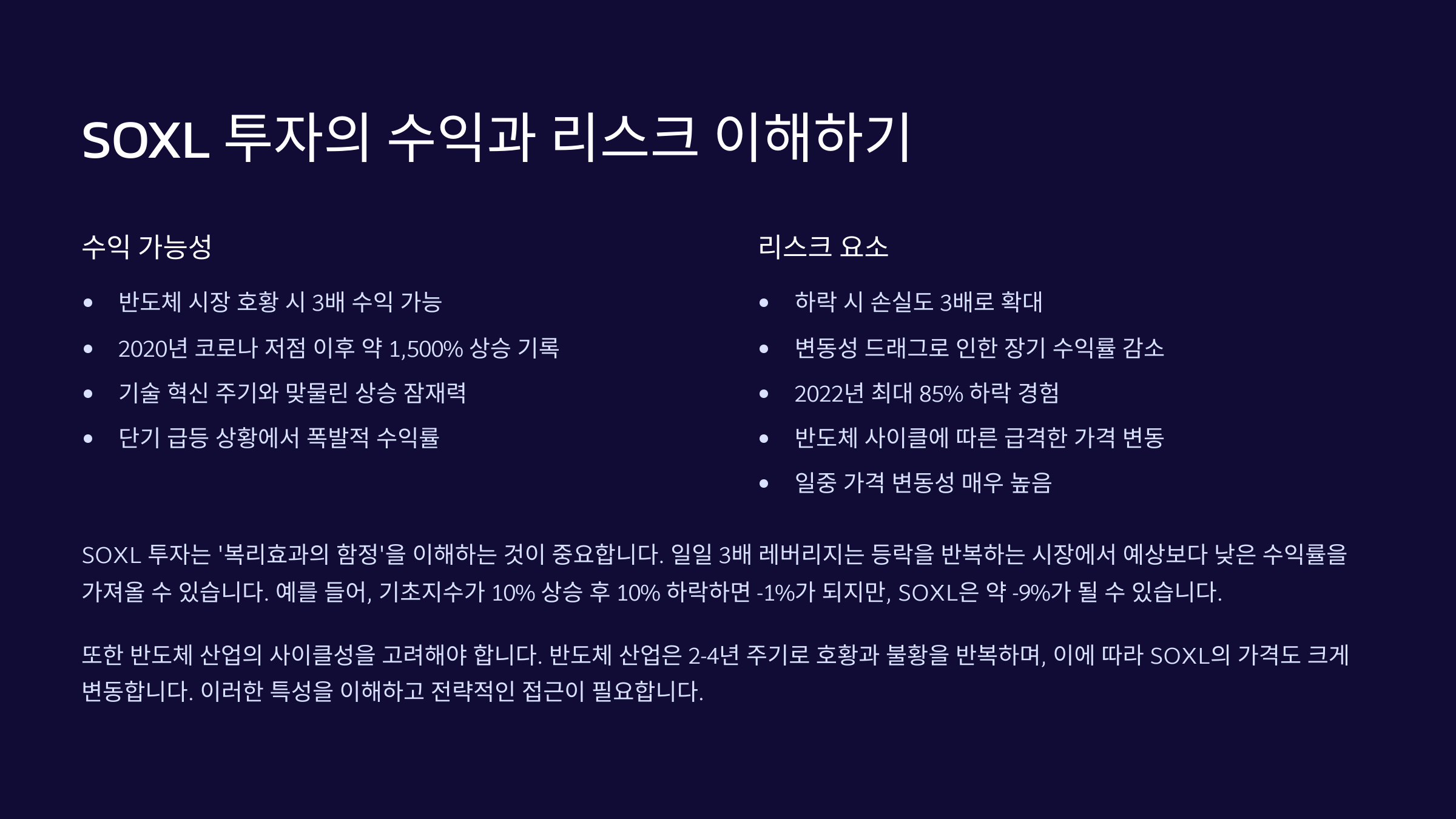 SOXL은 한 마디로 ‘고위험·고수익’ 투자의 대표 종목이에요. 지수가 오를 땐 3배로 빠르게 수익이 발생하고, 반대로 지수가 내리면 손실도 3배로 커져요. 이 때문에 단기간에 큰 수익을 올리는 사람이 있는 반면, 급락장에서는 원금 손실을 경험하는 사람도 많아요.