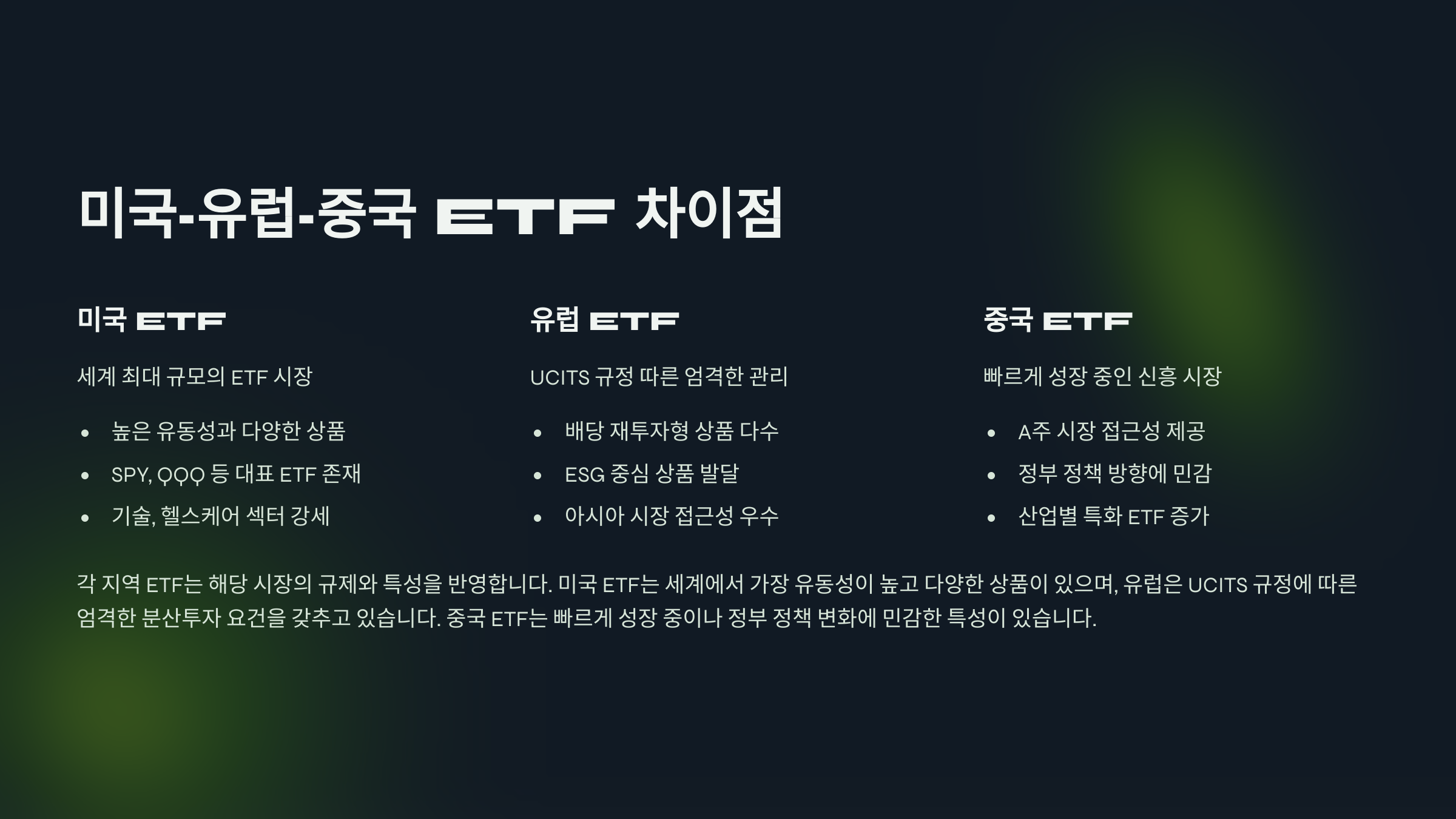 | 대표 테마 | S&P500, 나스닥100, 배당 | 유로존 산업, 섹터 ETF | 중국 기술주, 소비, 친환경 |
