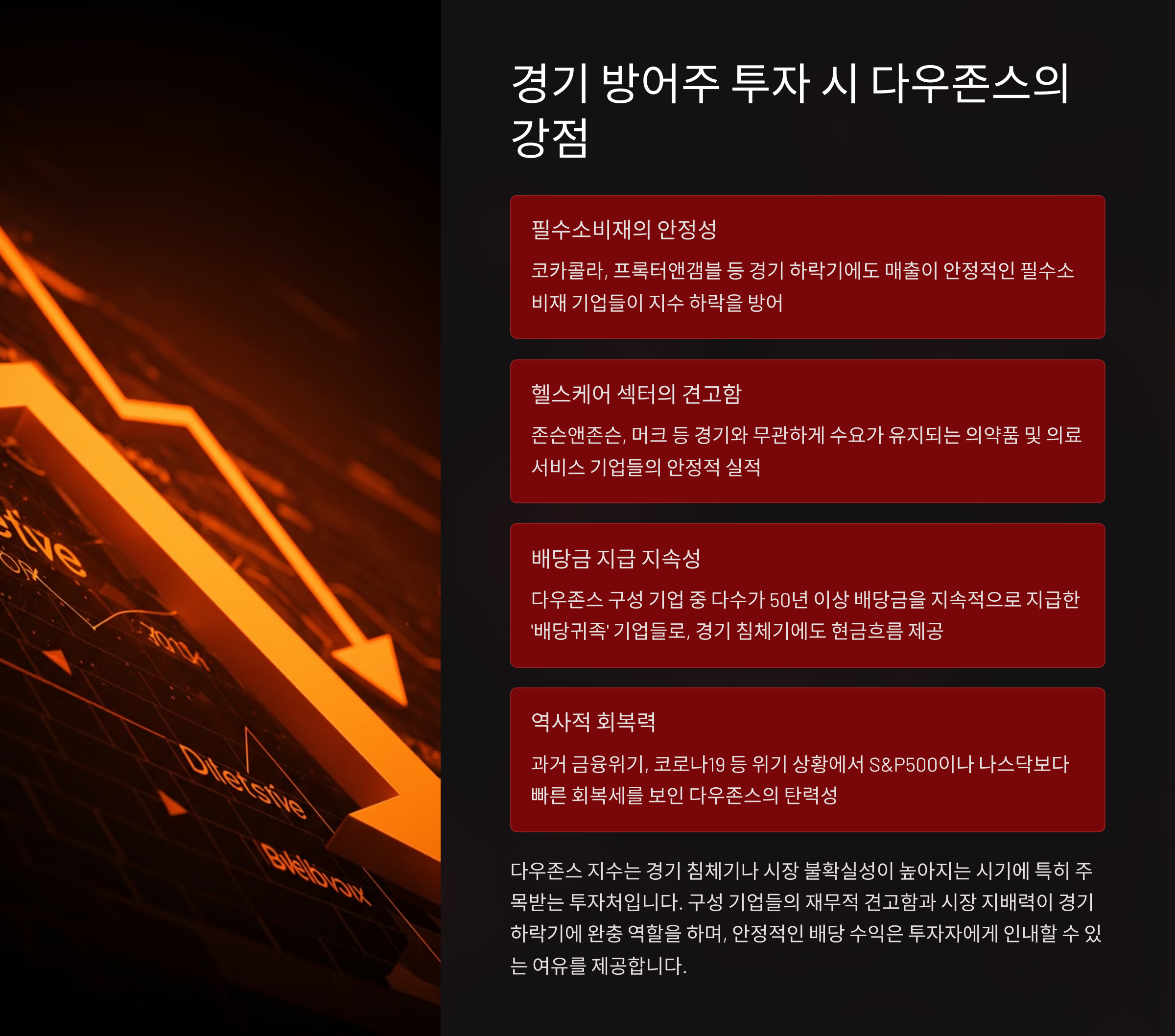 경제가 불확실할수록, 시장 변동성이 클수록 빛을 발하는 게 바로 경기 방어주예요. 그리고 다우존스 지수는 이 경기 방어주들을 자연스럽게 품고 있는 구조예요.