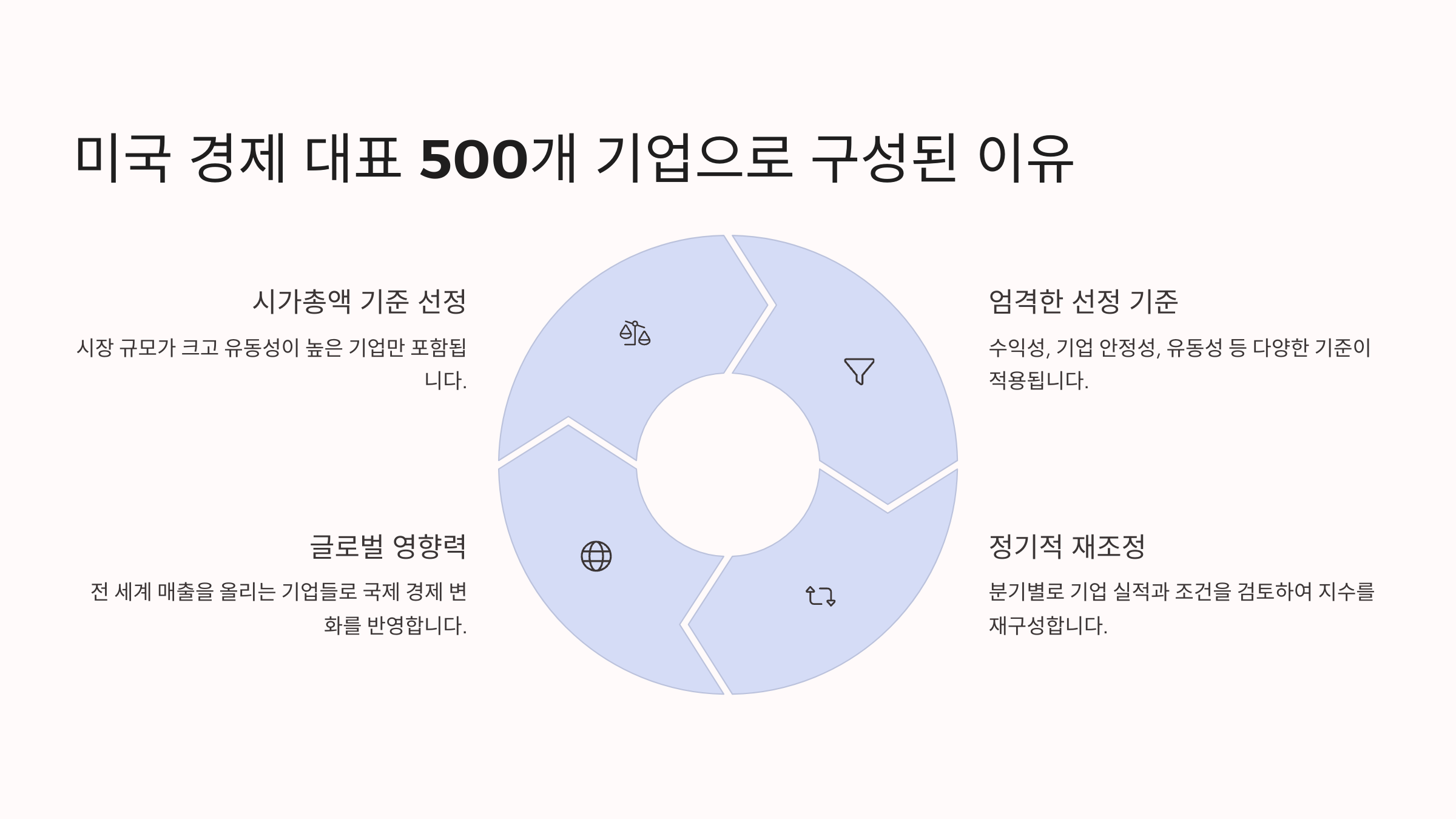 왜 500개일까요? 너무 적으면 산업별 대표성을 잃고, 너무 많으면 분석이 어려워져요. 그래서 500개라는 숫자는 ‘다양성과 효율성’을 동시에 잡을 수 있는 최적의 기준으로 여겨지고 있어요.