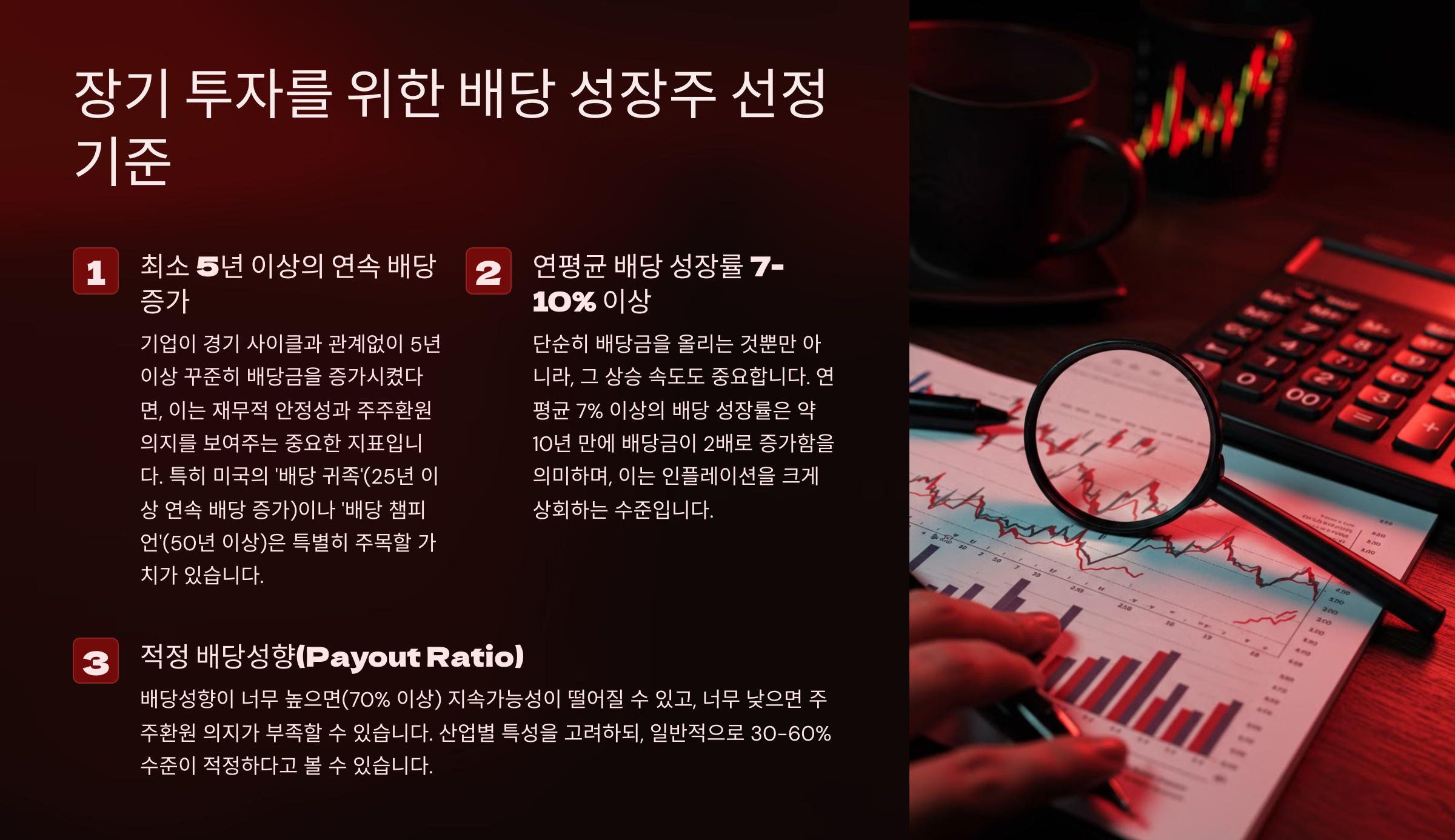 배당 성장주를 선정할 때 고려해야 할 핵심 체크 포인트 5가지를 정리해볼게요. 이 기준을 적용하면 안정적인 배당 수익과 함께 장기적으로 주가 상승까지 기대할 수 있어요.