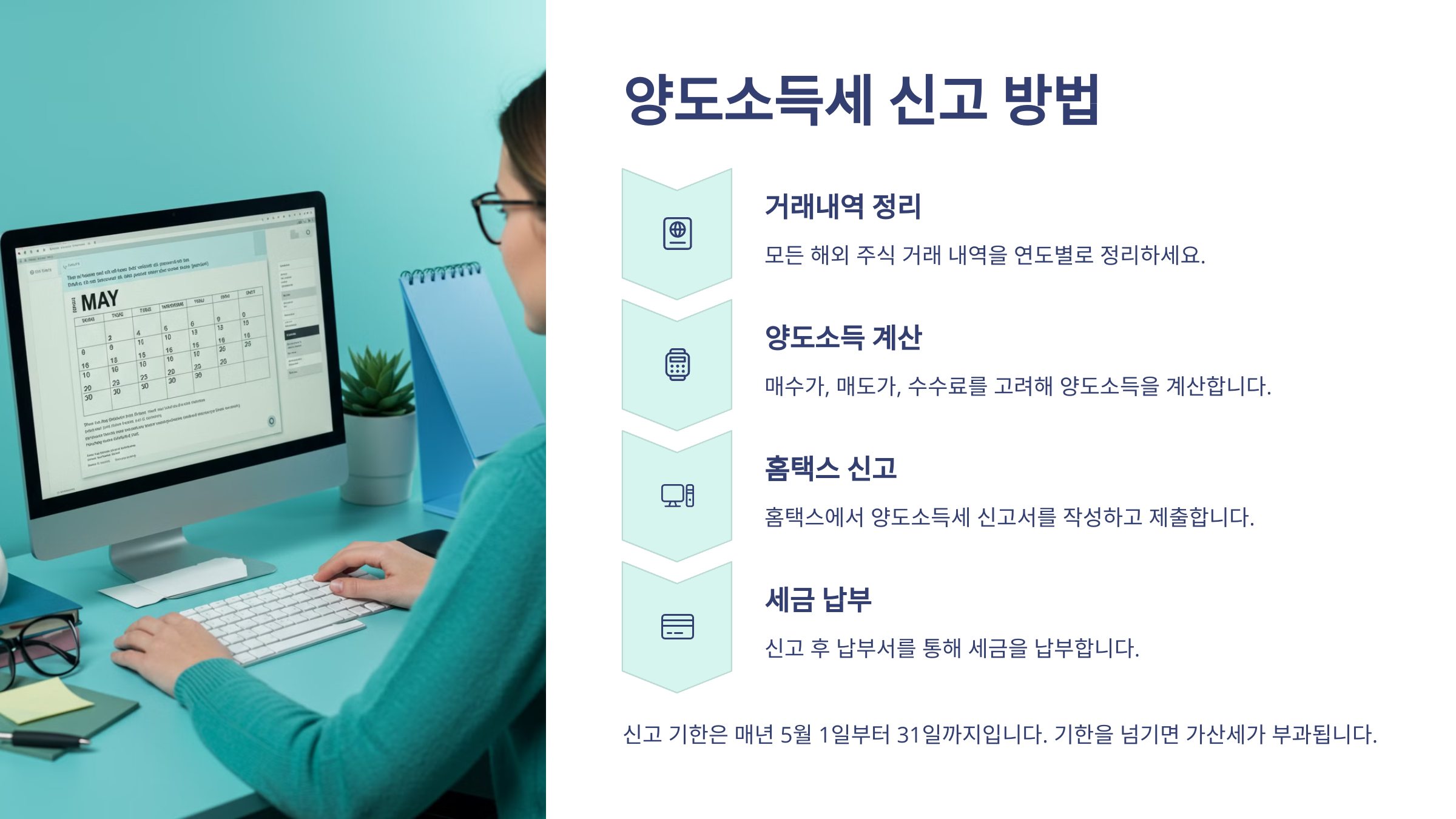해외 주식 양도소득세는 매년 '5월 31일'까지 신고해야 해요. 국세청에 신고하지 않으면 가산세가 부과될 수 있으니 기한을 반드시 지켜야 합니다.