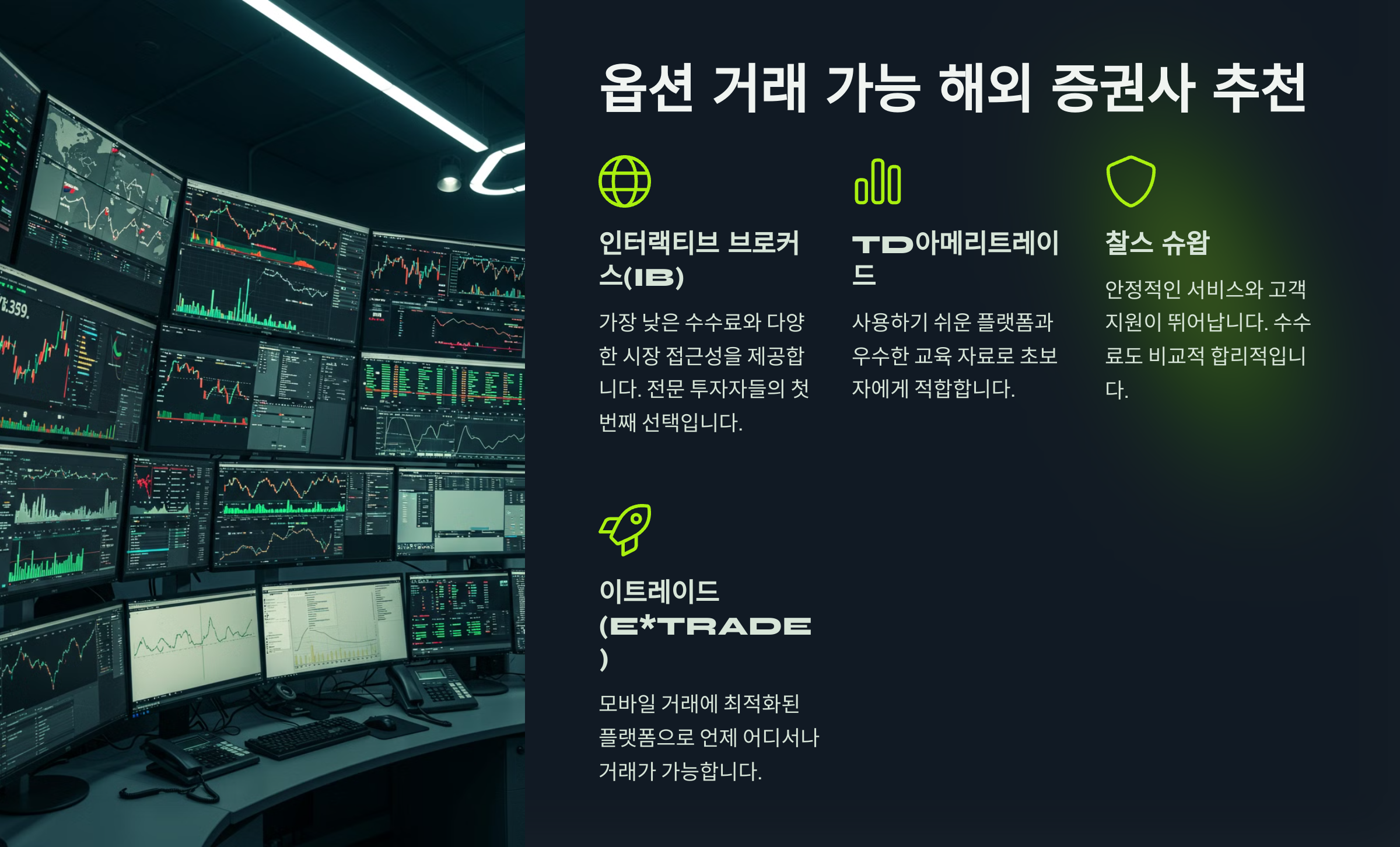 특히 해외 주식 옵션 거래는 미국 시장(NYSE, NASDAQ)에서 가장 활발하게 이루어지고 있으며, 한국 투자자들도 인터랙티브 브로커스(IBKR)나 TD 아메리트레이드 같은 해외 증권사를 통해 옵션 거래를 할 수 있어요.