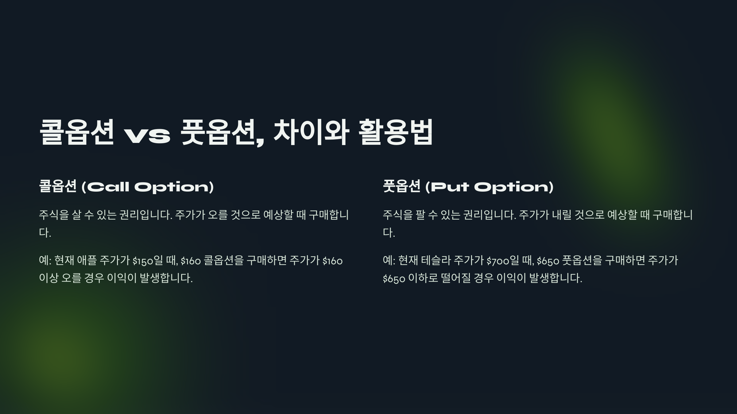 예를 들어, 애플(AAPL) 주식이 현재 $150일 때, 행사가격이 $160인 콜옵션을 매수하면 만기일까지 AAPL 주식을 $160에 매수할 권리를 갖게 돼요. 만약 AAPL 주가가 $170으로 상승하면 옵션을 행사하여 수익을 낼 수 있어요.