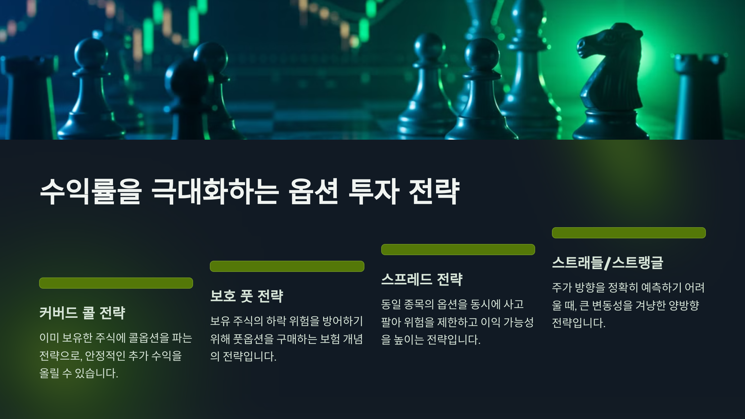 옵션 거래는 단순한 매수·매도가 아니라 다양한 전략을 활용하여 리스크를 줄이고 수익을 극대화할 수 있어요. 특히, 시장의 방향성을 예측하거나 변동성을 활용하는 전략이 많이 사용돼요.